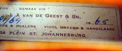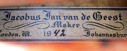 J J van de Geest’s personal output as violinmaker and his later contribution to the music life in South Africa is impressive: After completing his apprenticeship as violinmaker in Holland under the great master, Eberle, Jacobus Jan van de Geest (1899 – 1974) was for 18 years Master Craftsman and Chef d’atelier for London’s most important violin company – Hart & Son, under George Hart. Here he was in charge of assessments of and repairs to the world’s finest instruments. In London (and in fact in all of England and elsewhere) he established a reputation for supreme expertise and craftsmanship that stood him to credit for the rest of his life. When Hart & Son closed down in 1938, Van de Geest emigrated from London to Johannesburg, where he became the most important single force in South Africa’s violin world. He maintained his privileged relations with European experts and continued importing some of the finest violins available in Europe to his shop in Johannesburg. Many fabulous Cremonese and other instruments of great master violinmakers of the past made their way to South Africa through J J van de Geest’s work.