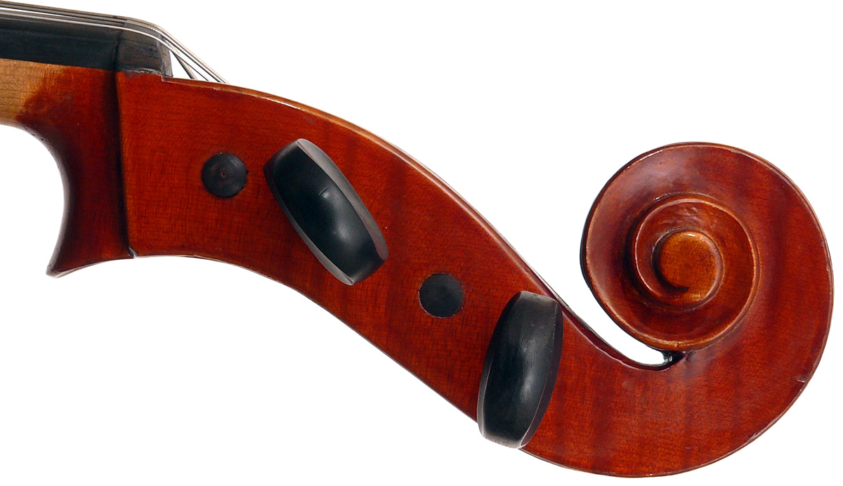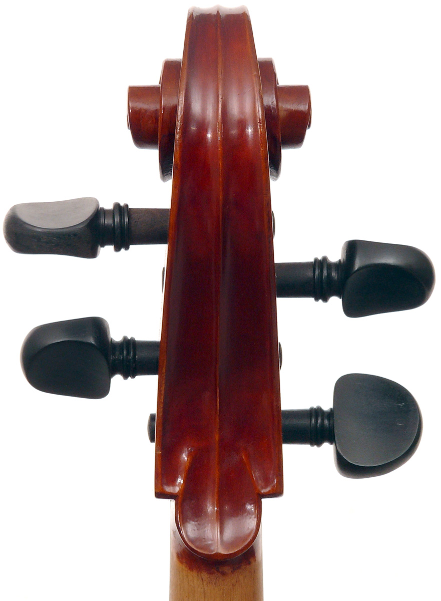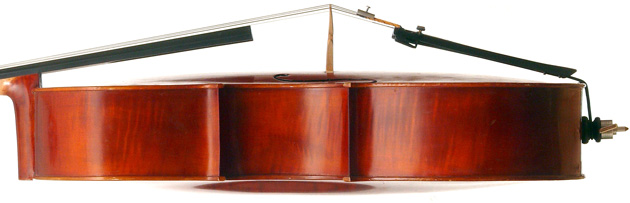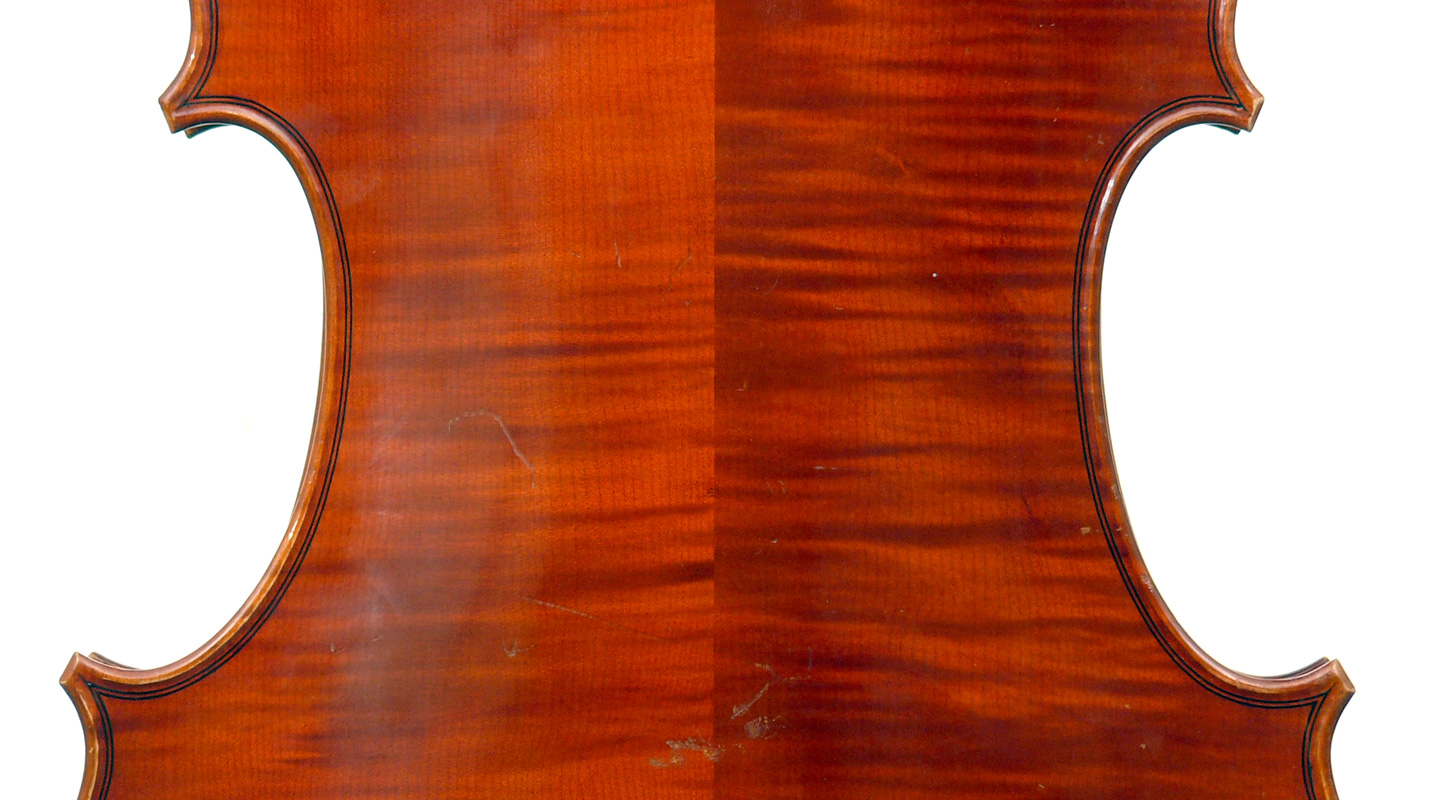 This cello is in excellent condition, completely free from cracks or repairs. The top is of very good tone spruce with wide grain. The two-piece back, ribs, neck and scroll are of mildly figured maple. The varnish is reddish brown and workmanship throughout represents the finest output of the Stentor company.