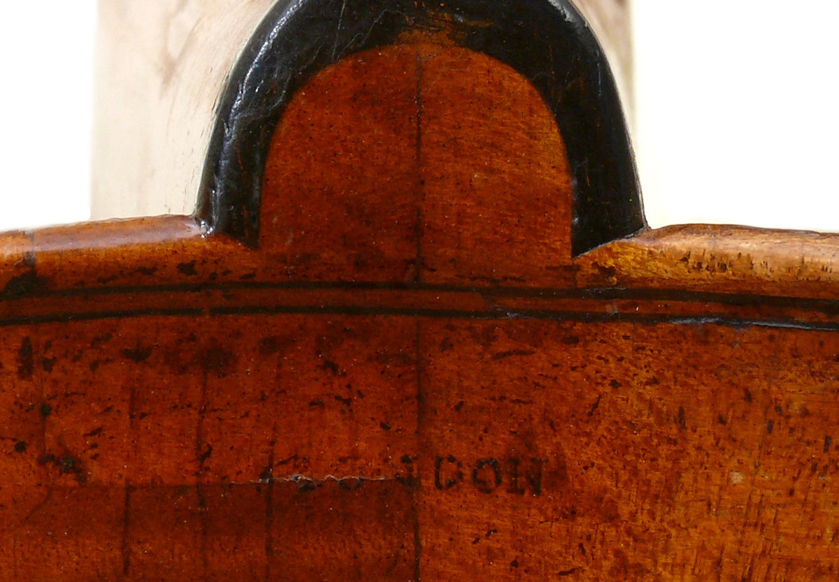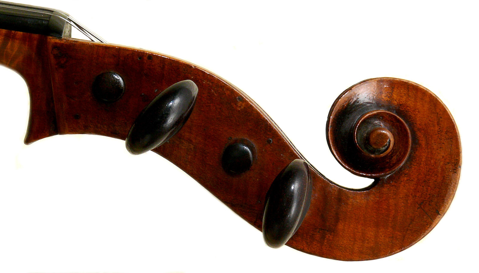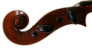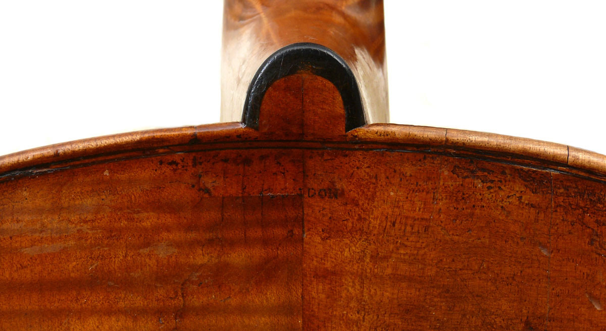 Everything about this instrument conforms to the textbook descriptions of the work of Richard Duke. The scroll and f-holes in particular are perfectly in character and style of the work of Duke. I have recently dealt with a violin by this maker and the scrolls are identical in every aspect. The word London is twice stamped into the back - just below the neck button and near the bottom edge, by the endpin (photos).