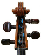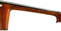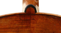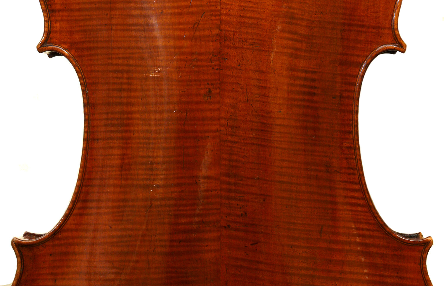 The two-piece back is of finely-curled maple, with a distinct and attractive flame. The ribs are of more broadly curled flame, hence not of the same wood. The top is of fine-to medium-grained tone spruce. Indications in the scroll are that the cello had been subject to at least two new necks (see photo of the graft) which would attest to much use over a long time - a good sign, since only good instruments are played on a lot. The current neck is truly a splendid affair of beautifully flamed wood -well-chosen and attractive and worthy of a fine instrument (see photo).