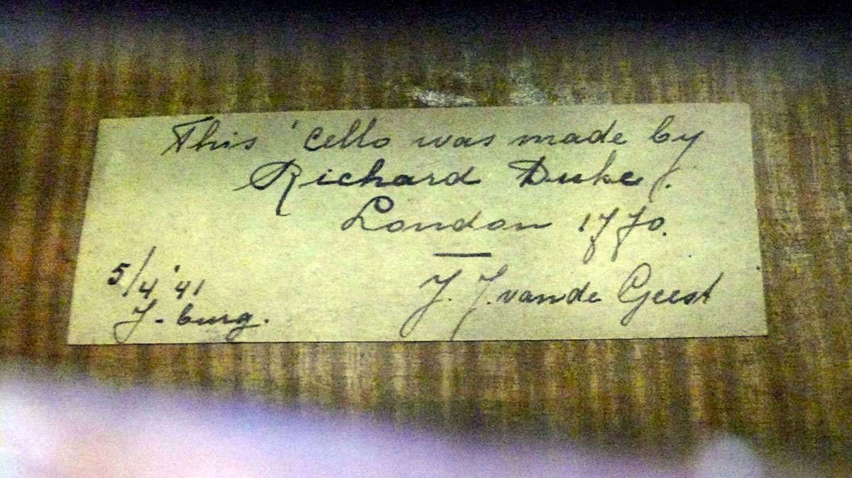This cello had been worked on by the important Dutch violin maker, J J van de Geest (d.1974), and bears a note inside confirming that the cello was by Richard Duke, made in London in 1770 (see photo). Van de Geest was certainly qualified to make such an assertion since he was, for 18 years, in charge of the London workshop of George Hart & Son, until 1938, when he moved to South Africa. George Hart & Son was then the most important violin firm in London, and at the time of his leaving there, Van de Geest had been exposed for many years to the finest instruments in the world, having routinely worked on them. His extensive knowledge of the work of the masters, made of him a recognized authority of a high order throughout England and Europe. After establishing himself in Johannesburg, until his death in 1974, Van de Geest imported a steady flow of fine instruments into South Africa, and one can assume safely that he brought this cello to this country. Furthermore, he was an internationally recognized restorer and expert - it would stand to reason that the work done on this instrument was by his hand.