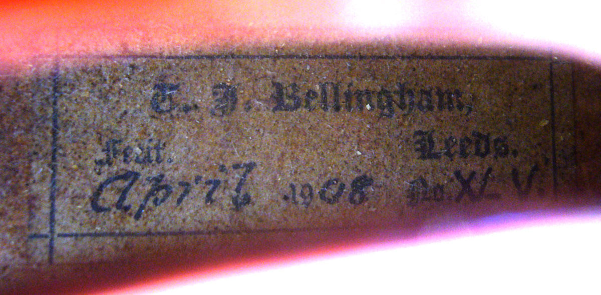 Thomas J. Bellingham (1853 - 1927) lived and worked in Leeds and came to violinmaking only late in life - he began this craft in 1902, at the age of 49. In a newpaper interview from about 1915 it appears that he had at that stage made 43 violins, 4 violas and 3 cellos. In his lifetime he completed 90 violins.
