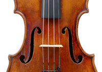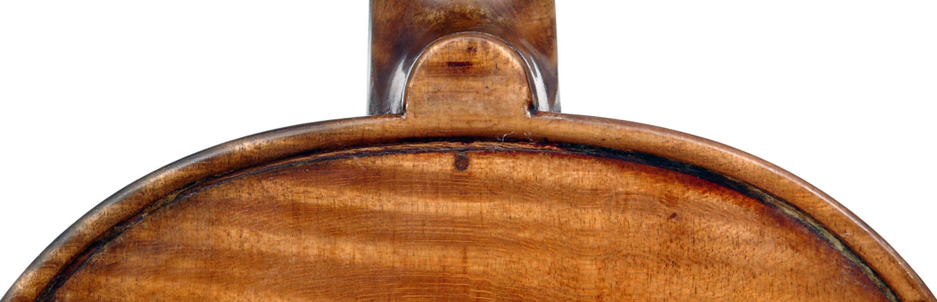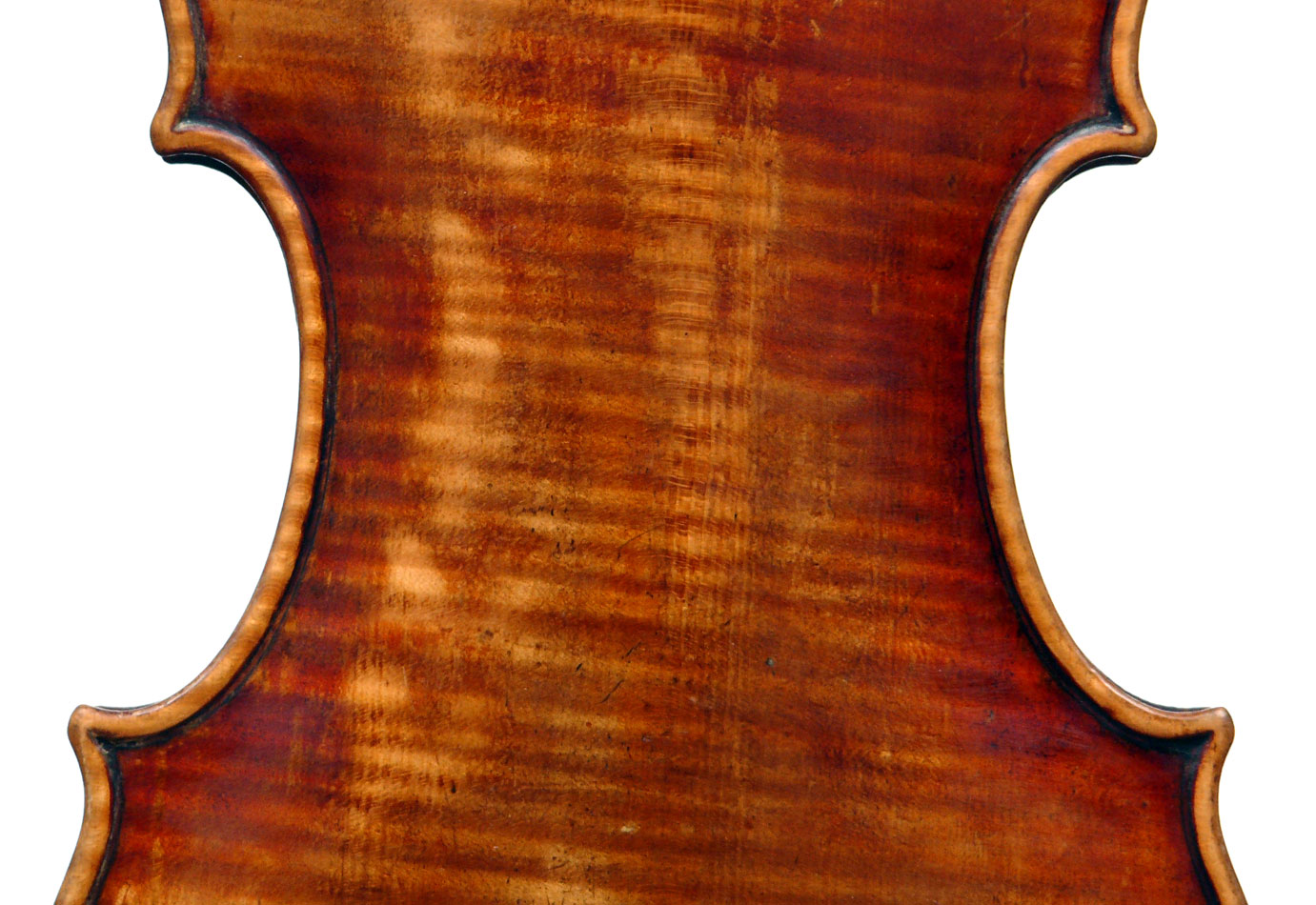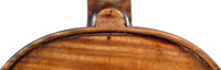 This unlabelled instrument is in my view a fine violin and not a trade instrument. Throughout it is made of excellent materials - a beautiful one-piece back of nicely flamed maple with a medium and distinct curl, repeated in the sides, neck and scroll. The scroll particularly is striking in its wood and cut and shows an excellent steady and well-trained hand. The top is of good-quality medium grained tone spruce.