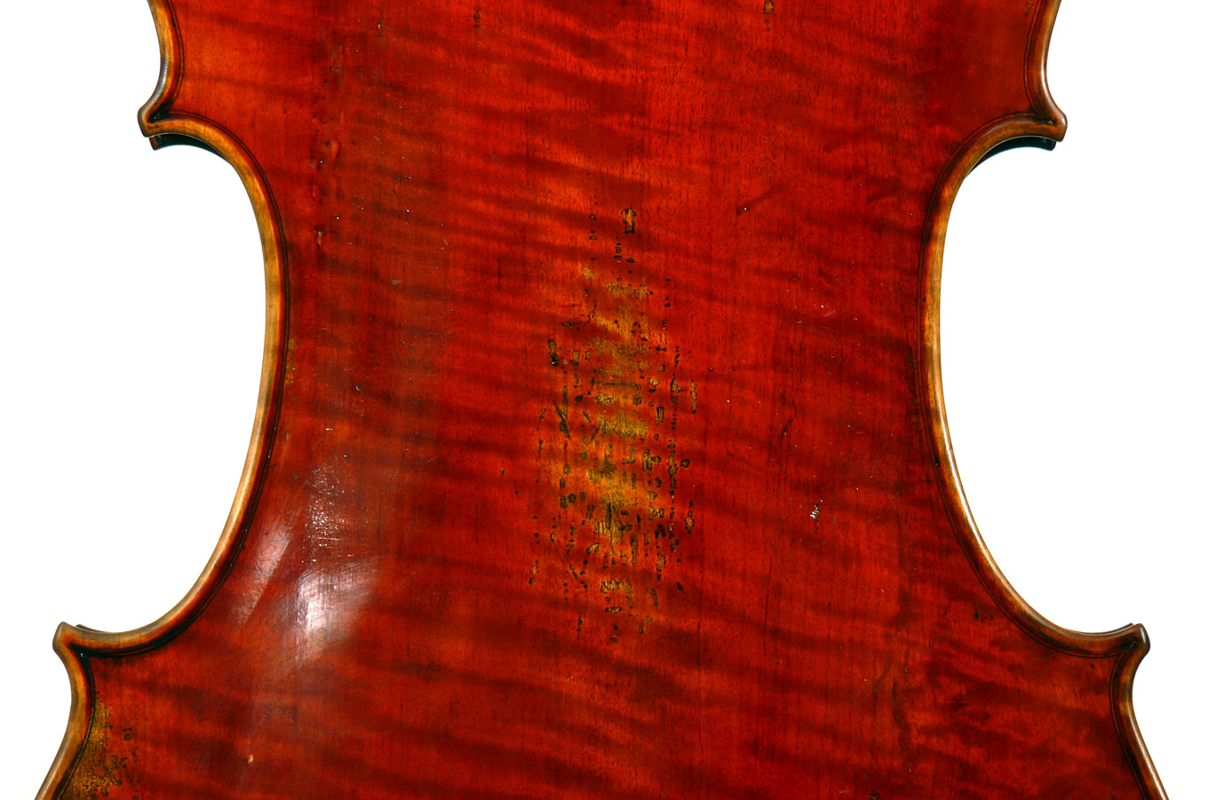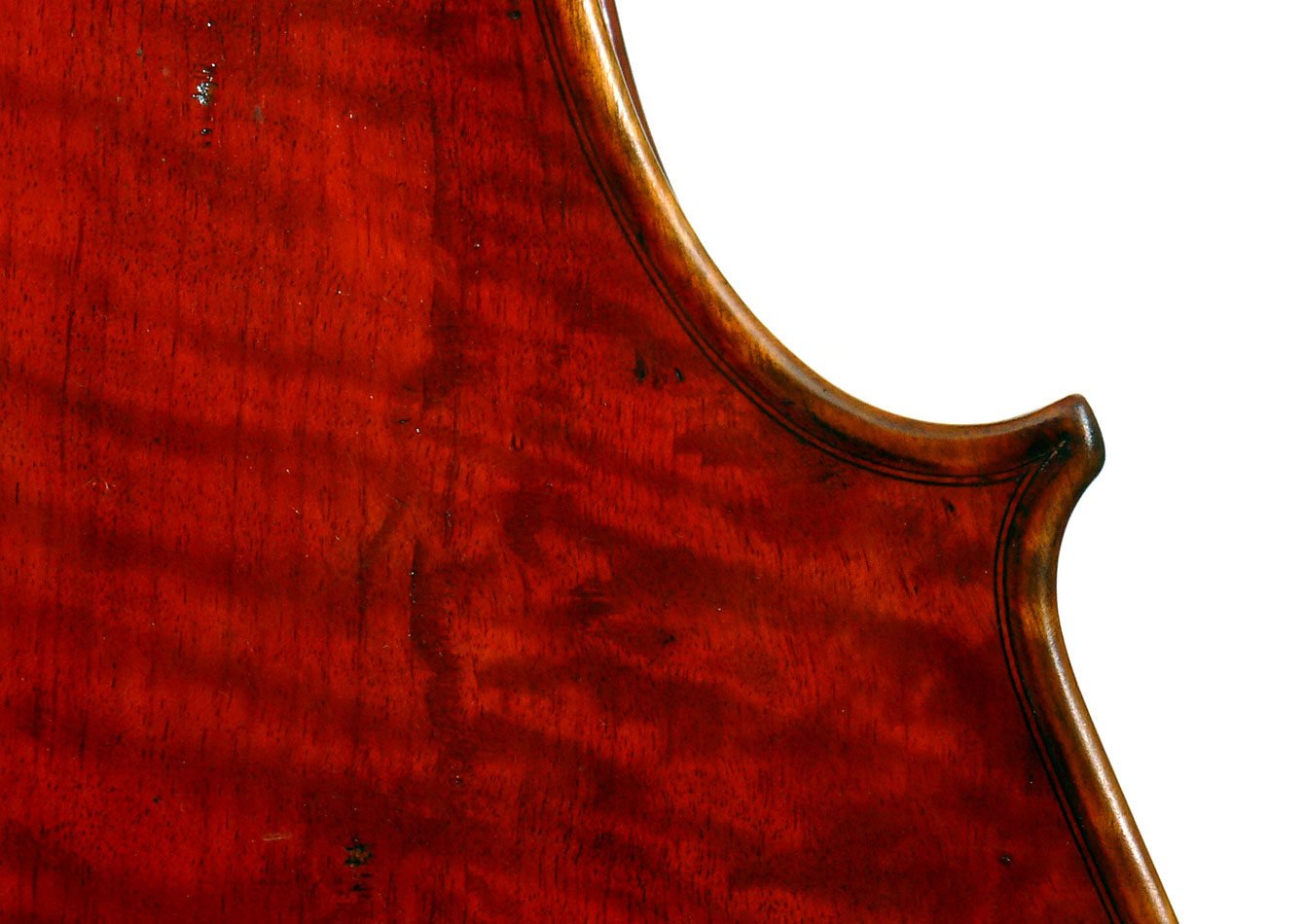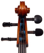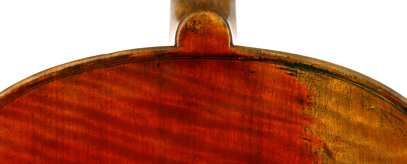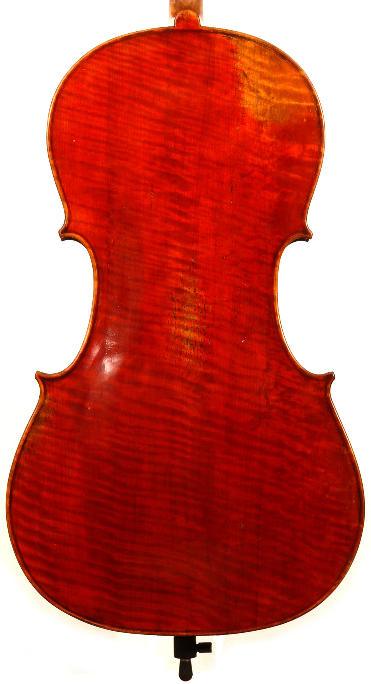 A striking feature of this particular cello is its one-piece back - of nicely flamed maple with a mild medium curl (see photos). This is attractive and desirable, as it is difficult and costly to find a single piece of wood big enough for a complete cello back. And this cello has good tone - even throughout and speaking with openness and responsiveness, easy to play on. The materials are well chosen - the sides appear to be matched with the wood of the beautiful one-piece back, showing attention to detail and to the traditions of good lutherie. Workmanship is very good throughout - tidy work in the corners and purfling neatly traced. Varnish is a strong amber to red-brown oil-based application that really nicely compliments the wood.