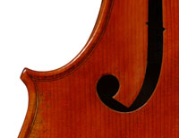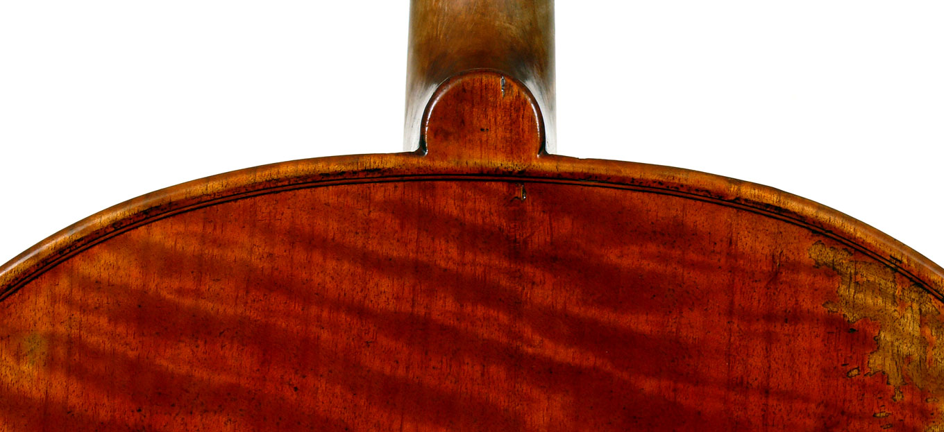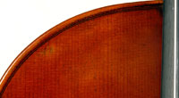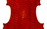 A striking feature of this particular cello is its one-piece back - of nicely flamed maple with a mild medium curl (see photos). This is attractive and desirable, as it is difficult and costly to find a single piece of wood big enough for a complete cello back. And this cello has good tone - even throughout and speaking with openness and responsiveness, easy to play on. The materials are well chosen - the sides appear to be matched with the wood of the beautiful one-piece back, showing attention to detail and to the traditions of good lutherie. Workmanship is very good throughout - tidy work in the corners and purfling neatly traced. Varnish is a strong amber to red-brown oil-based application that really nicely compliments the wood.