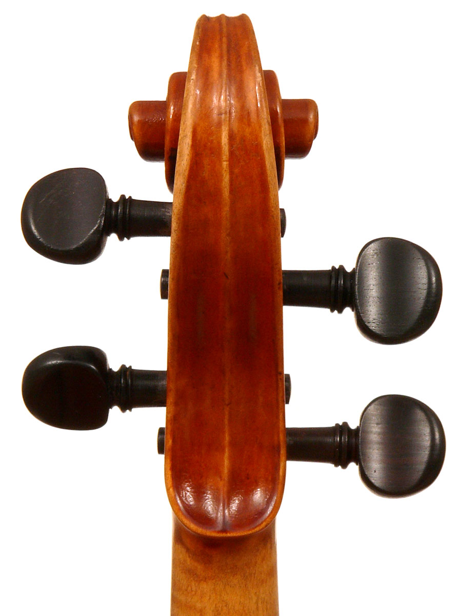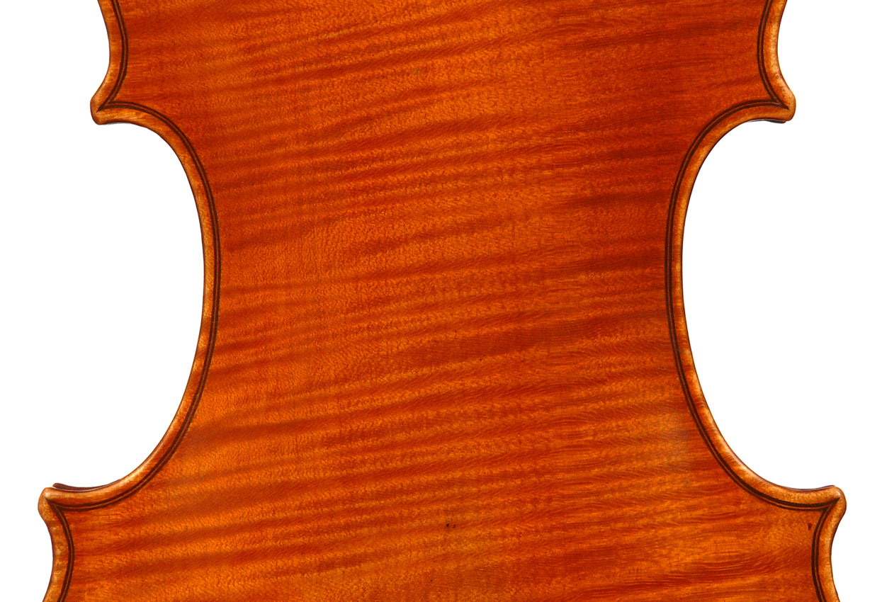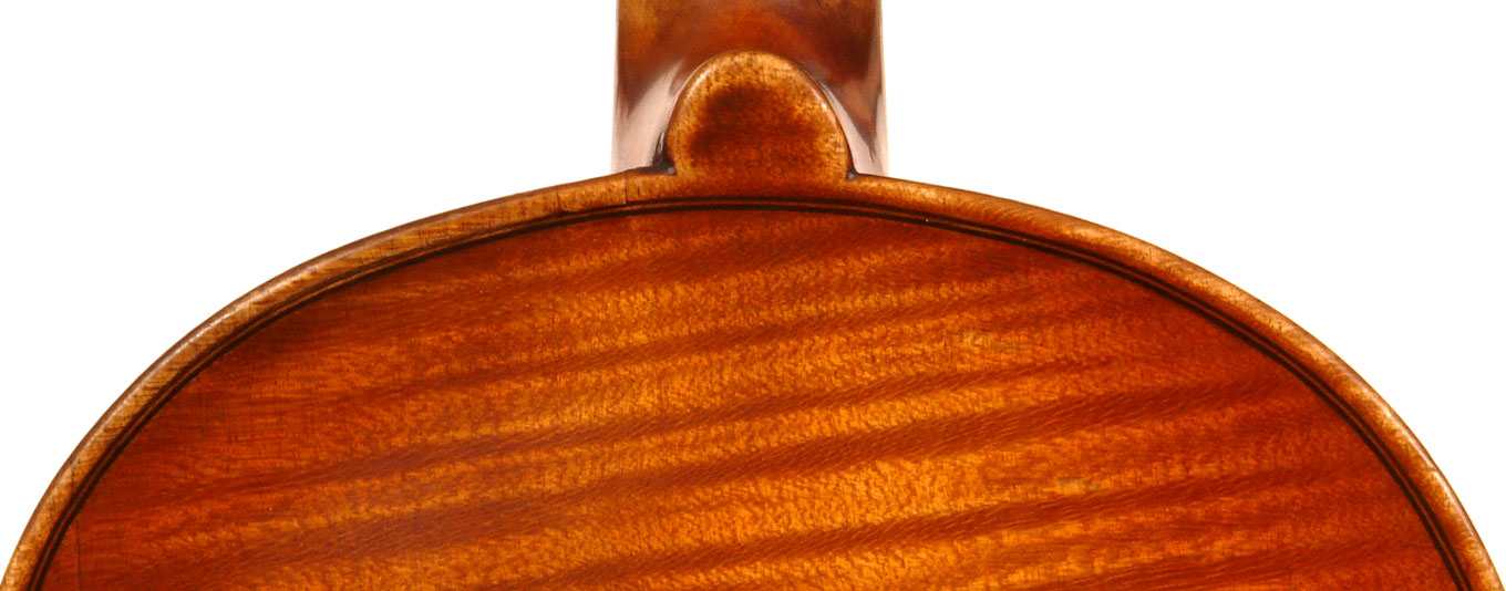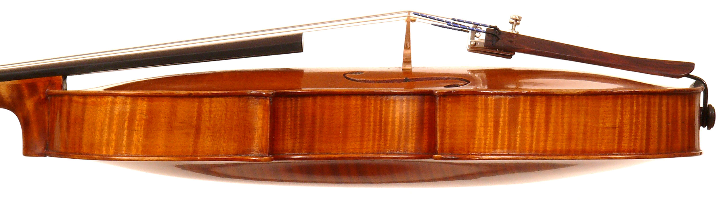 This violin is a very attractive instrument made from a well-chosen selection of wood. The one-piece back is unusually appealing with its distinct richly flamed maple of a medium curl, rising from left to right. The ribs, neck and scroll appear to be of the same material, displaying a rich flame which doesn't fail to seduce. The fine tone spruce top has the unusual feature of a distinct 'bear's claw' marking - a type of cross grain 'flame' which is rare in spruce and which is highly desirable with some makers. The f-holes, or a shorter pattern, are nicely placed and elegant. The arching in the back is distinctly deeper than in the top. Purfling and corner work throughout is very good with a steady hand. The light golden brown oil-based varnish compliments the wood with high transparency, showing off the materials beautifully.