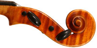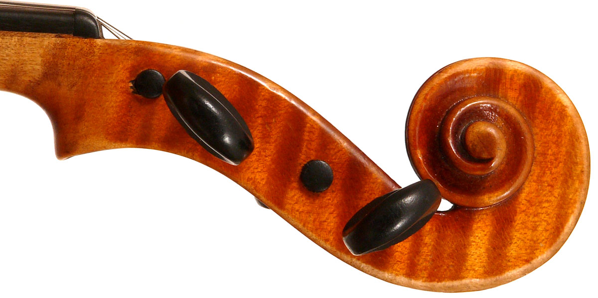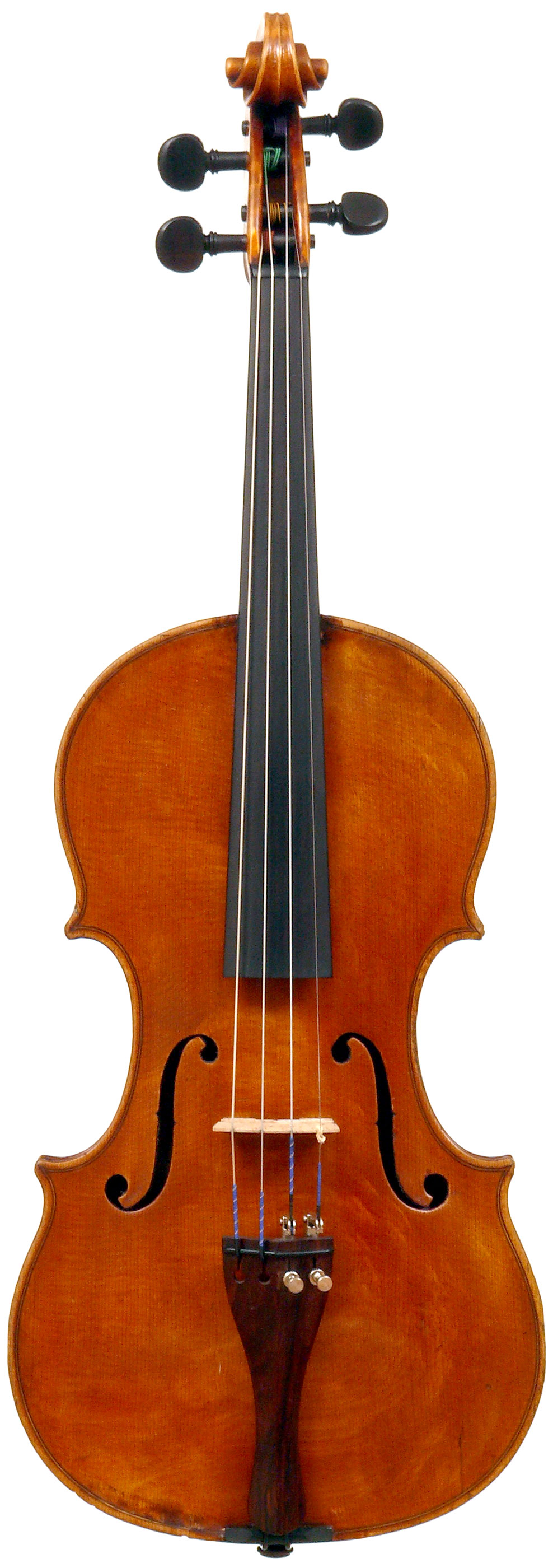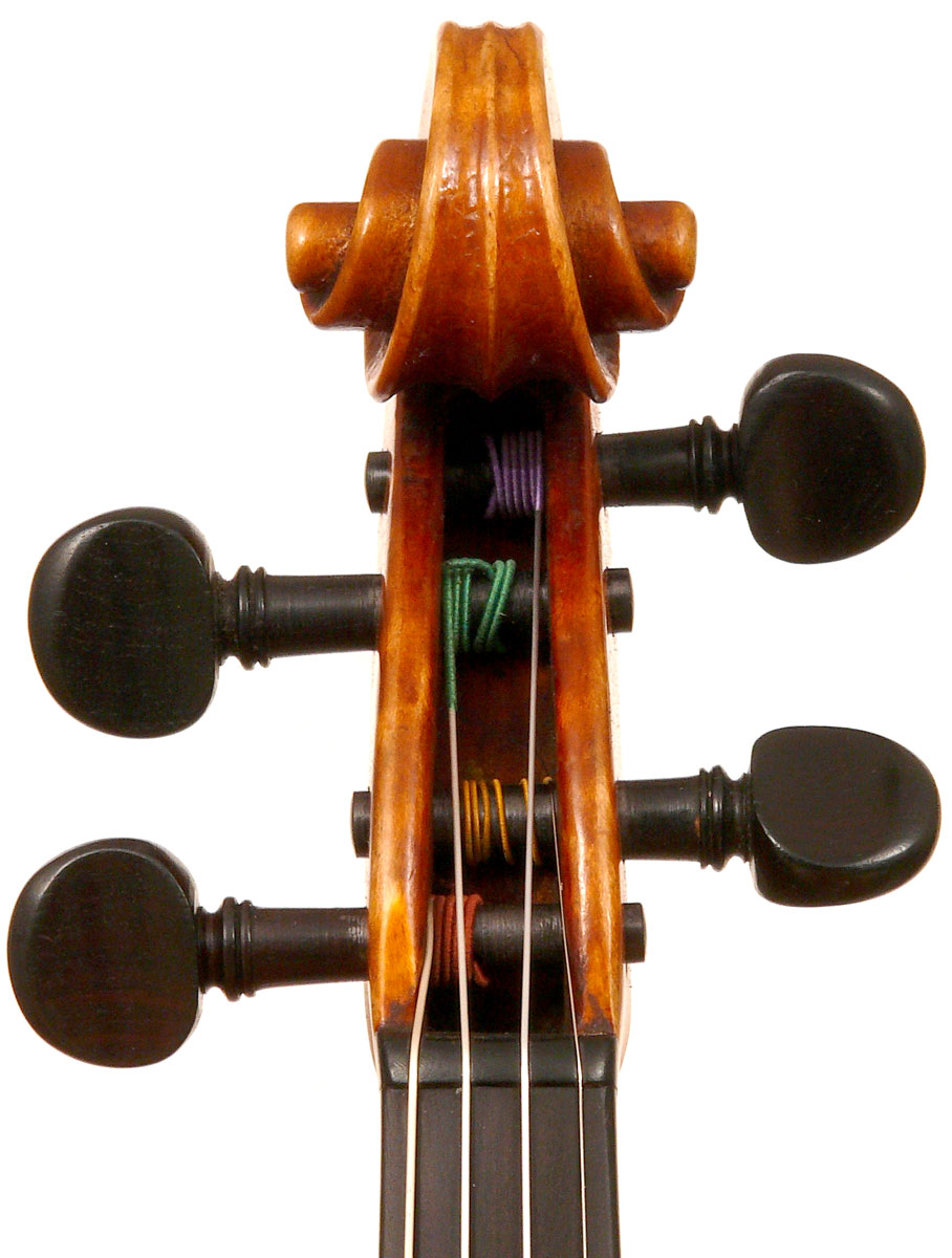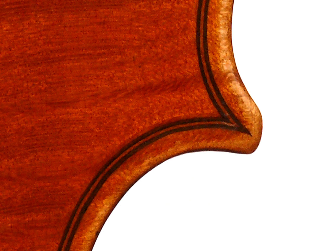 This violin is a very attractive instrument made from a well-chosen selection of wood. The one-piece back is unusually appealing with its distinct richly flamed maple of a medium curl, rising from left to right. The ribs, neck and scroll appear to be of the same material, displaying a rich flame which doesn't fail to seduce. The fine tone spruce top has the unusual feature of a distinct 'bear's claw' marking - a type of cross grain 'flame' which is rare in spruce and which is highly desirable with some makers. The f-holes, or a shorter pattern, are nicely placed and elegant. The arching in the back is distinctly deeper than in the top. Purfling and corner work throughout is very good with a steady hand. The light golden brown oil-based varnish compliments the wood with high transparency, showing off the materials beautifully.