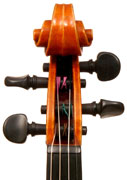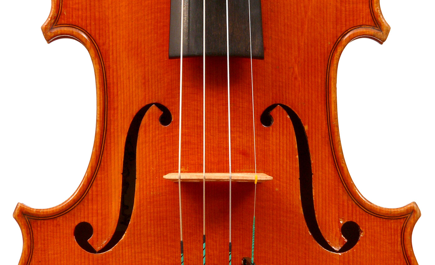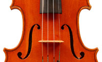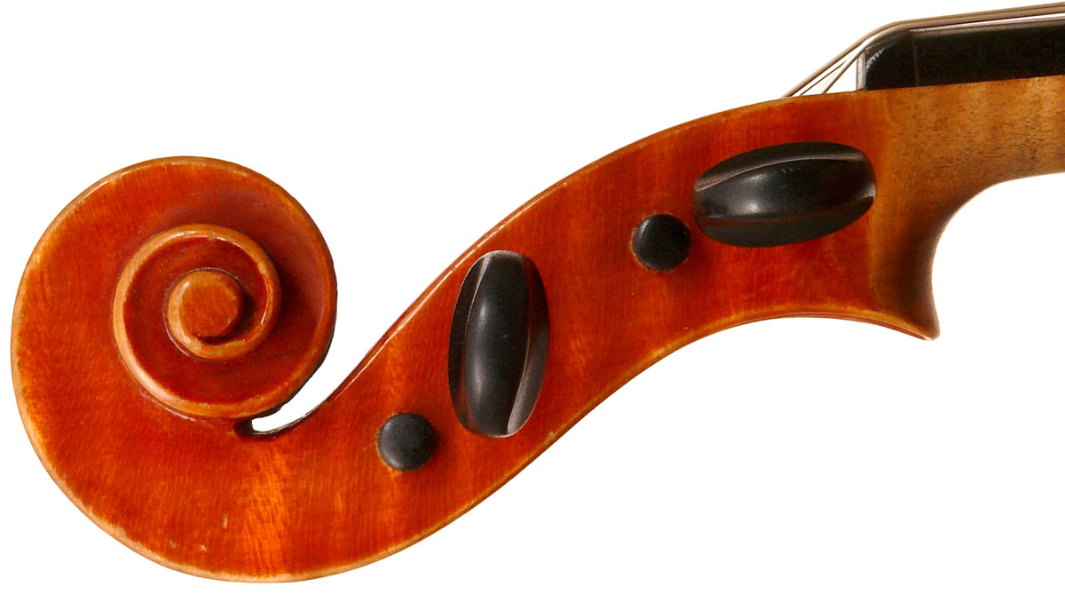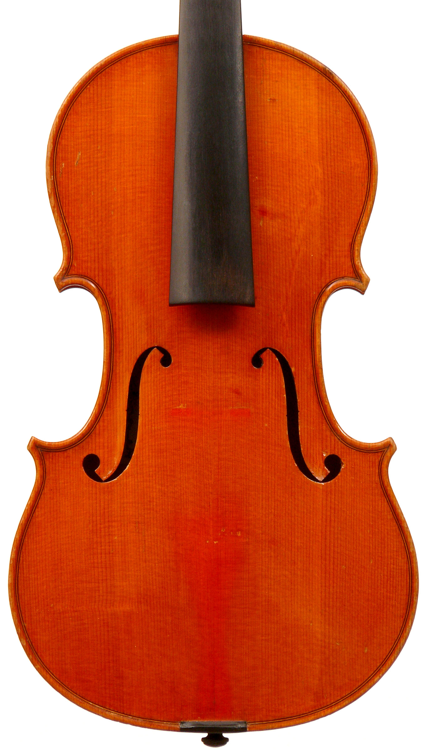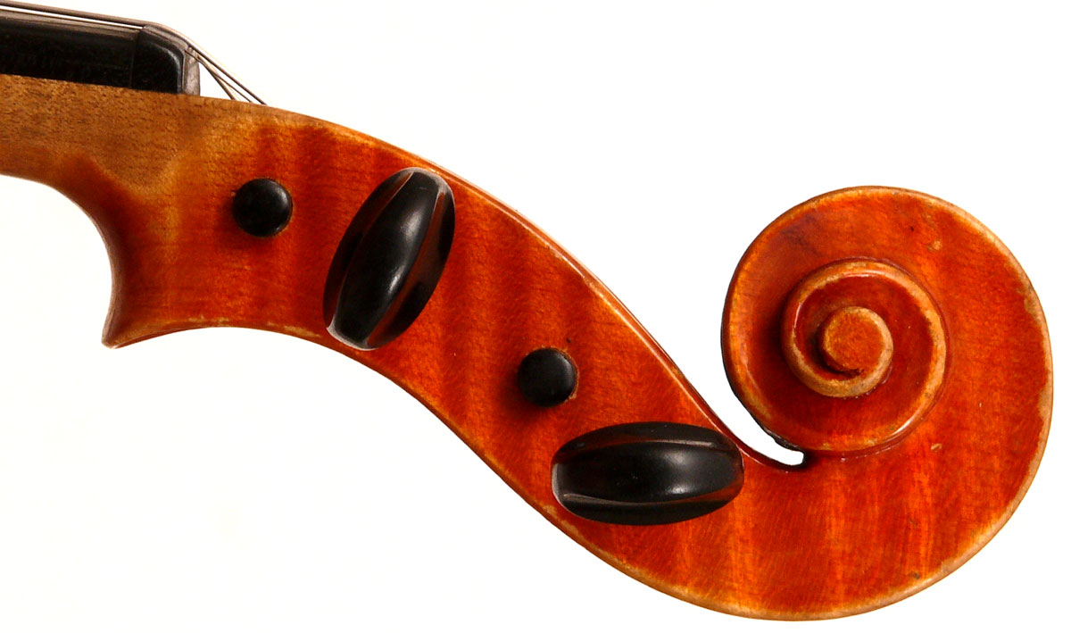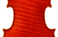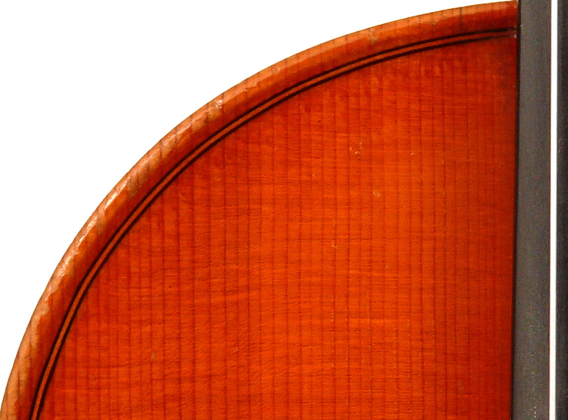 The top is of excellent tone spruce with a straight even medium grain and slight "bear's claw" flame - excellent material. The beautiful one-piece back, ribs, neck and scroll appear to be made from the same mildly flamed medium curled maple. Purfling is impeccable, the scroll nicely balanced and elegant, the f-holes are crisp and refined. What strikes one most about this violin is the unusually transparent varnish - of a beautiful reddish golden color - which allows one not only to see the wood clearly, but lets one see right into the wood - a rare quality in varnish and again showing the mastery of this maker.