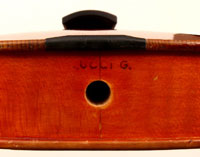 Other than bearing signed labels, his instruments are almost always branded above the tailpin and in the centre of the back, inside.