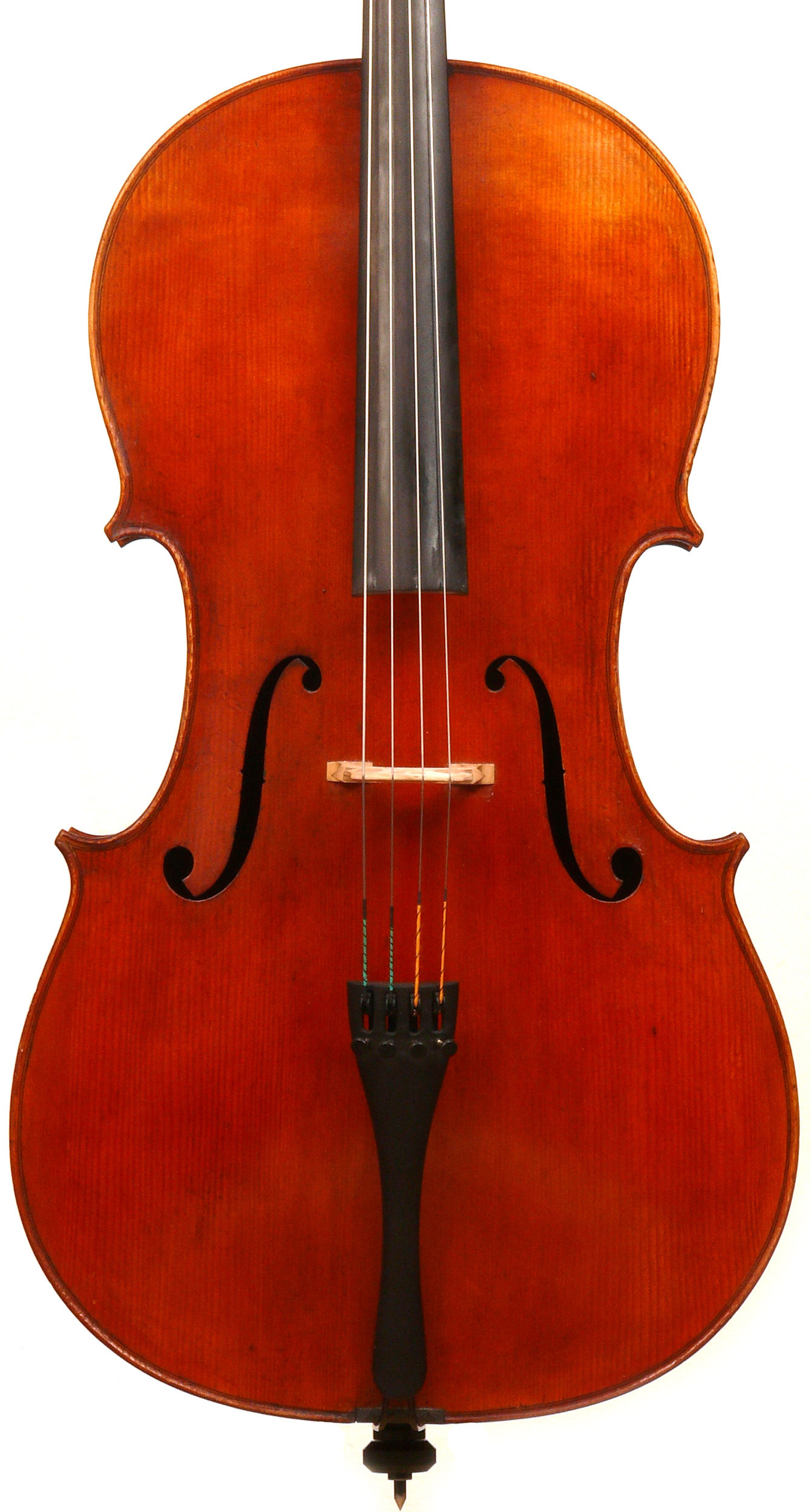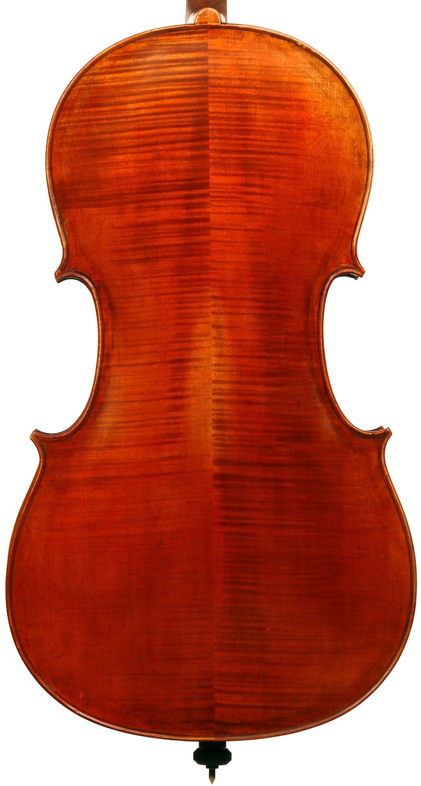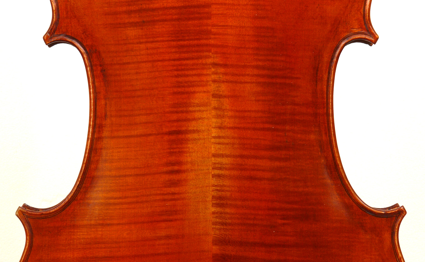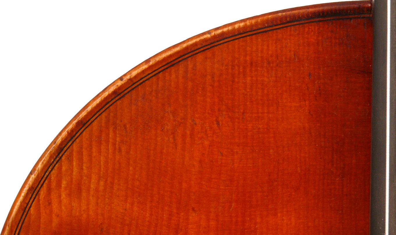 It seems that the cello was made some time between 1920 and 1930. It is well-made and attractive from every point of view. The pale red-brown golden varnish beautifully compliments the materials - a top of fine tone spruce with a medium grain opening to the flanks. F-holes are nicely positioned, somewhat slanted and elegant. Ribs and two-piece back are of maple with a mildly flamed straight medium curl. The purfling is well-traced and elegant with excellent corner work - attesting to a fine and experienced hand.