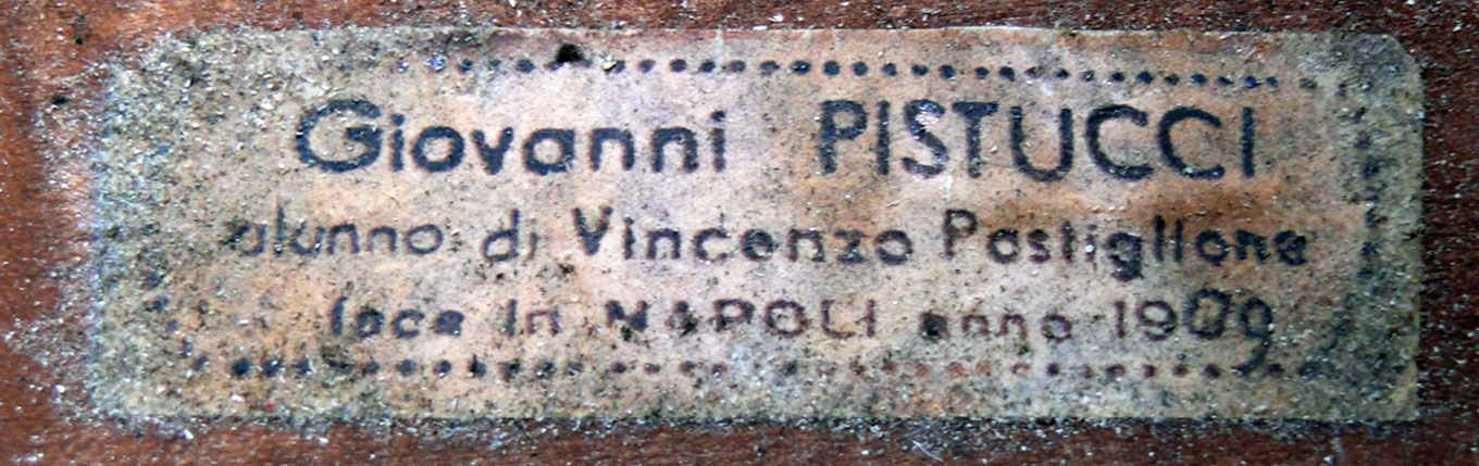 Though this cello is labeled as the work of Giovanni Pistucci (1909), no knowledgeable person at any point was convinced that it is Pistucci's work. That aspect was seriously considered by various individuals - notably it was examined by Charles Beare about 4 years ago. Beare thought that though the cello was interesting, the label was spurious. During 2011 the cello was in Cremona and was examined by the noted authority, Eric Blot, who stated that the instrument is not by Pistucci. He considered that it may be of East-European origin, but nevertheless gave it a very high price assessment. Strictly speaking the instrument remains of unknown origin.
