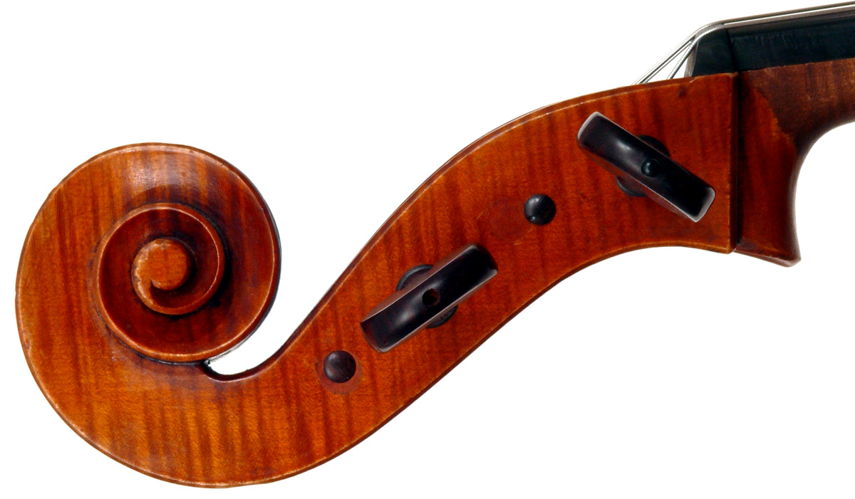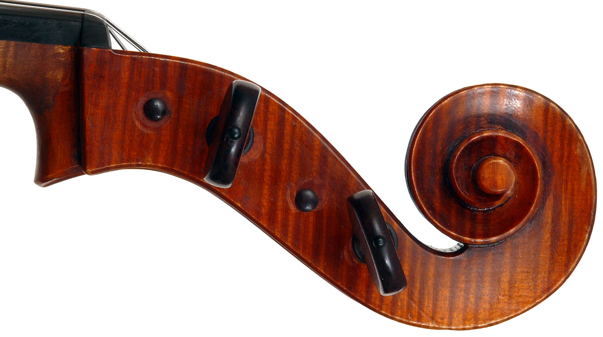 An interesting divergence is that the material for the neck and scroll differs radically inasmuch as it is of exceptionally good, finely curled and nicely-flamed maple. The scroll is very attractive, conforming to a high standard of workmanship - strong yet elegant and finely balanced. The pegbox has been rebushed on all pegs, attesting to a lot of use of this instrument and a good testimony to its excellent properties. The pegs are of rosewood. My personal view is that the neck may later, by another maker, but that remains conjecture.