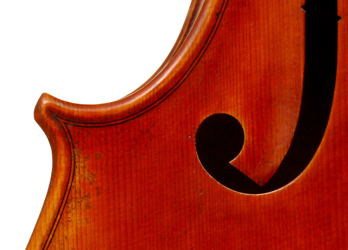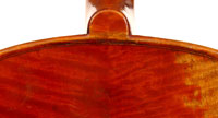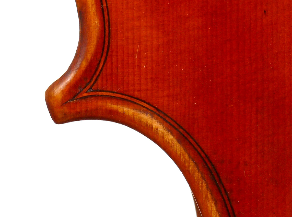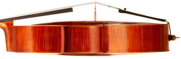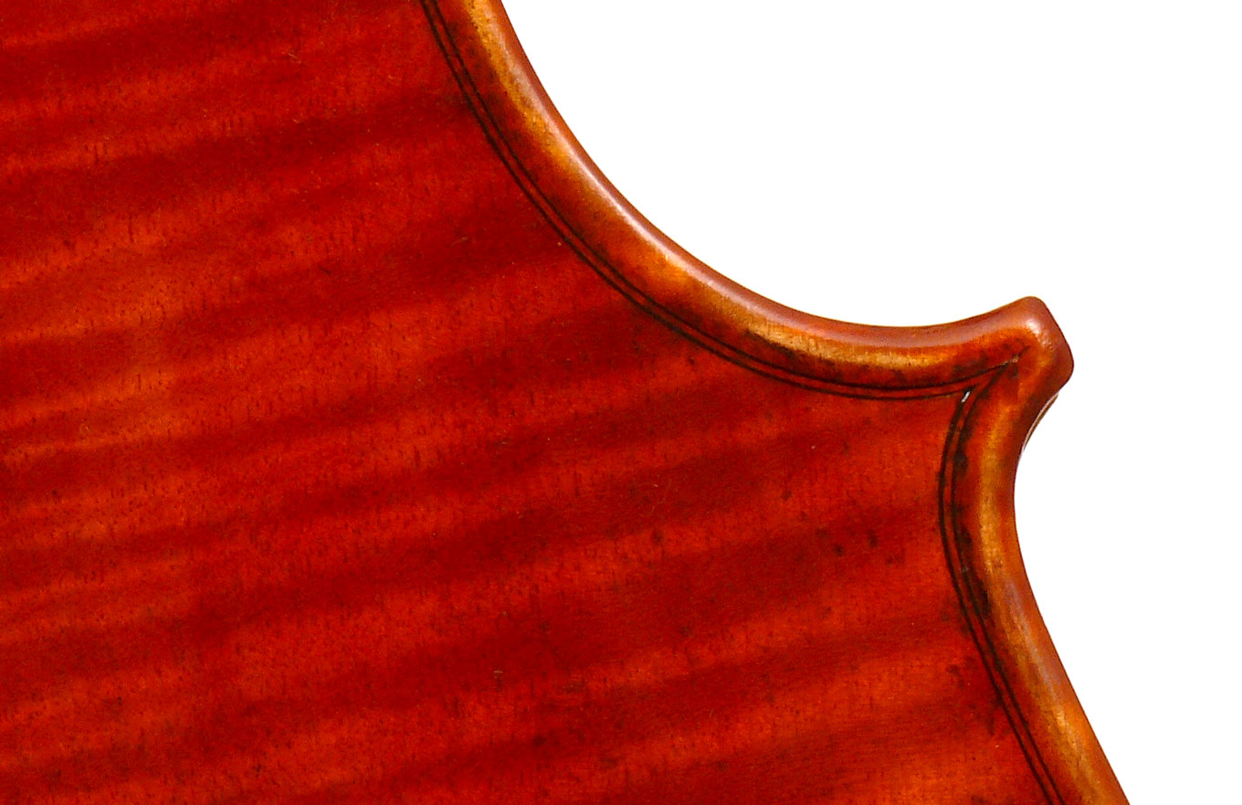 This cello is characterised by a really pleasing tone - even throughout and speaking with openness and responsiveness, easy to play on. The materials are well chosen - a beautiful two-piece back and sides of well-figured maple with a medium curl. A darker mark in the upper right bout is a natural sap mark in the wood and adds character to the instrument. It has no structural implication. Workmanship is very good throughout - tidy work in the corners and purfling neatly traced. Varnish is an amber oil-based application.