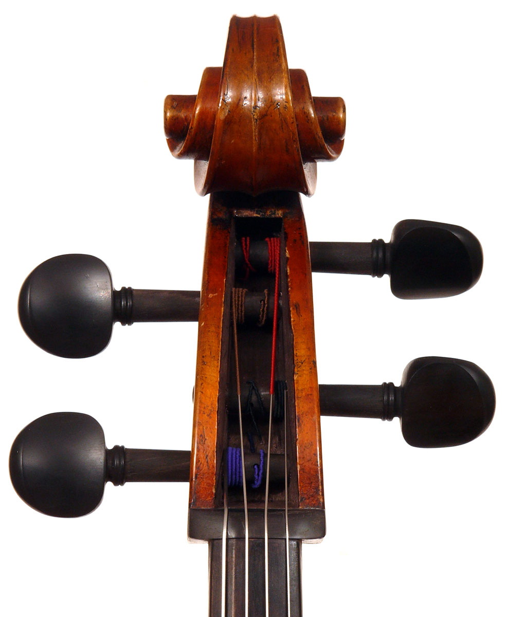 This cello is new, but has been artificially "antiqued" to look much older and worn than it actually is. Today such antiquing is not regarded as trickery or deceit, but is acceptable and very much the norm in lutherie, adding character and visual interest to an instrument.