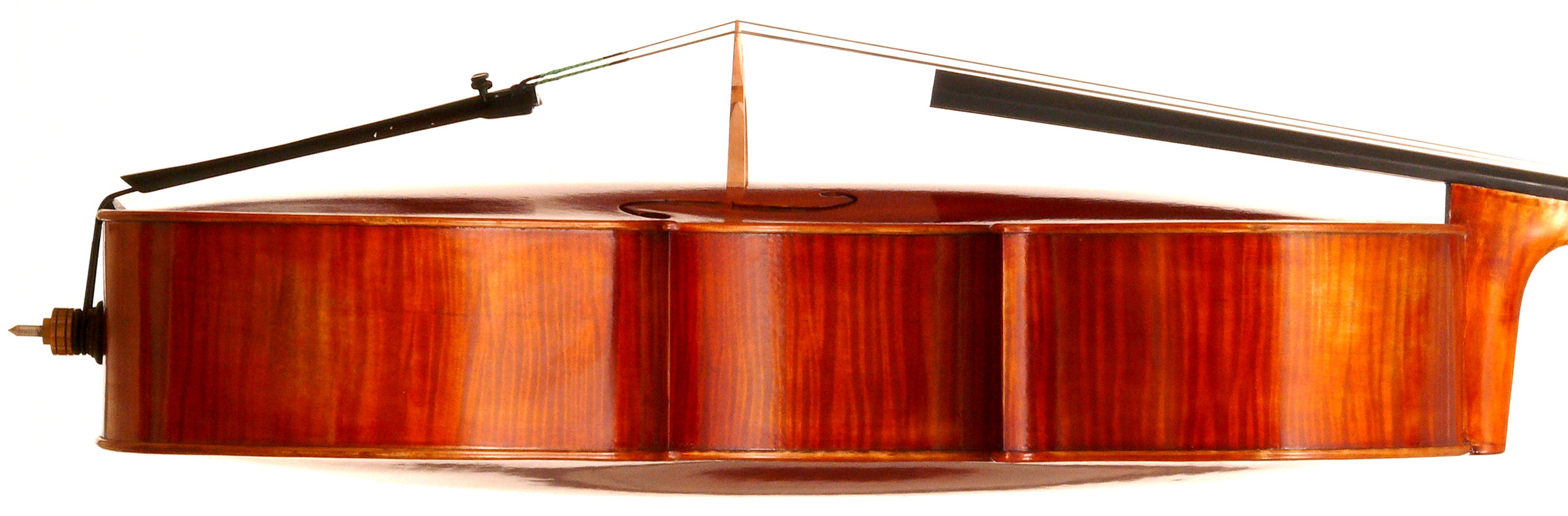 As with the other similar celli on this page, this instrument represents the top-end trade fare that is increasingly establishing itself in the international arena where excellent workmanship, very good tone and fine materials meet in a good, satisfying, responsive and above all, affordable, instrument. These instruments compete with the best output of some leading master instrument builders, providing an accessible alternative to the expensive fine hand made instruments produced in some of the leading European violinmaking studios.