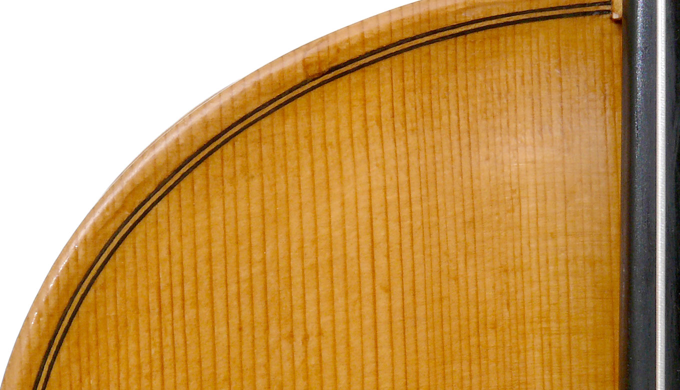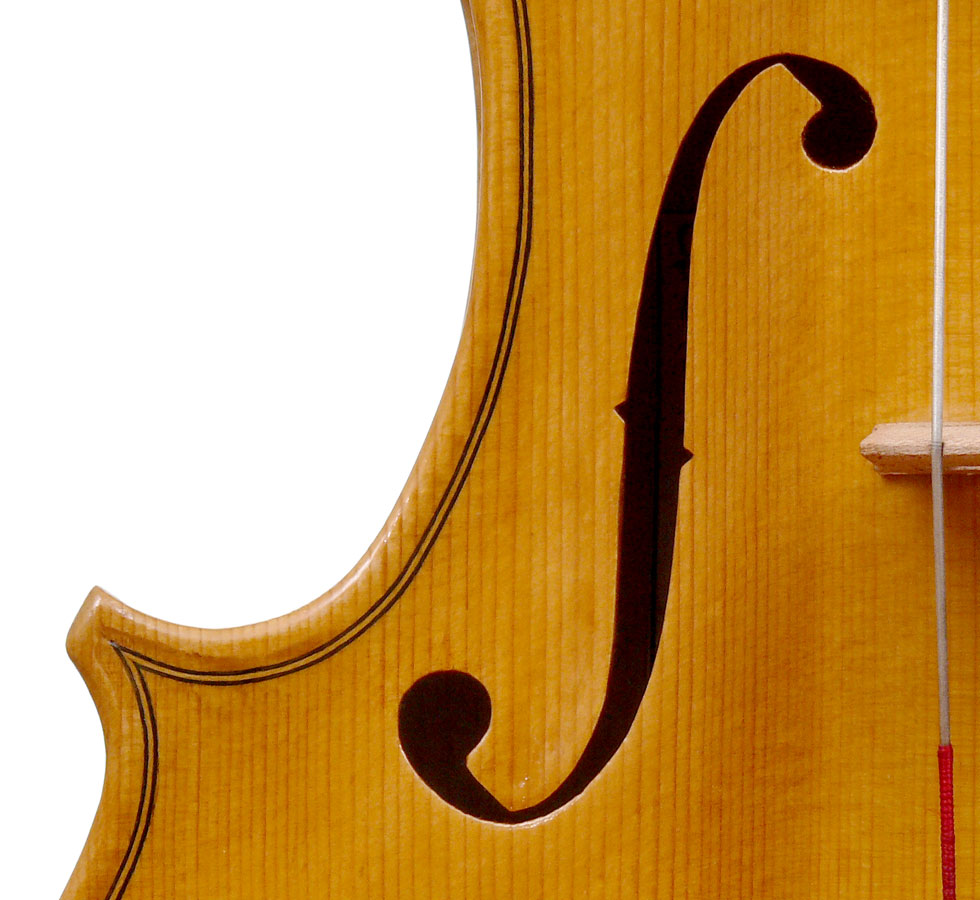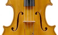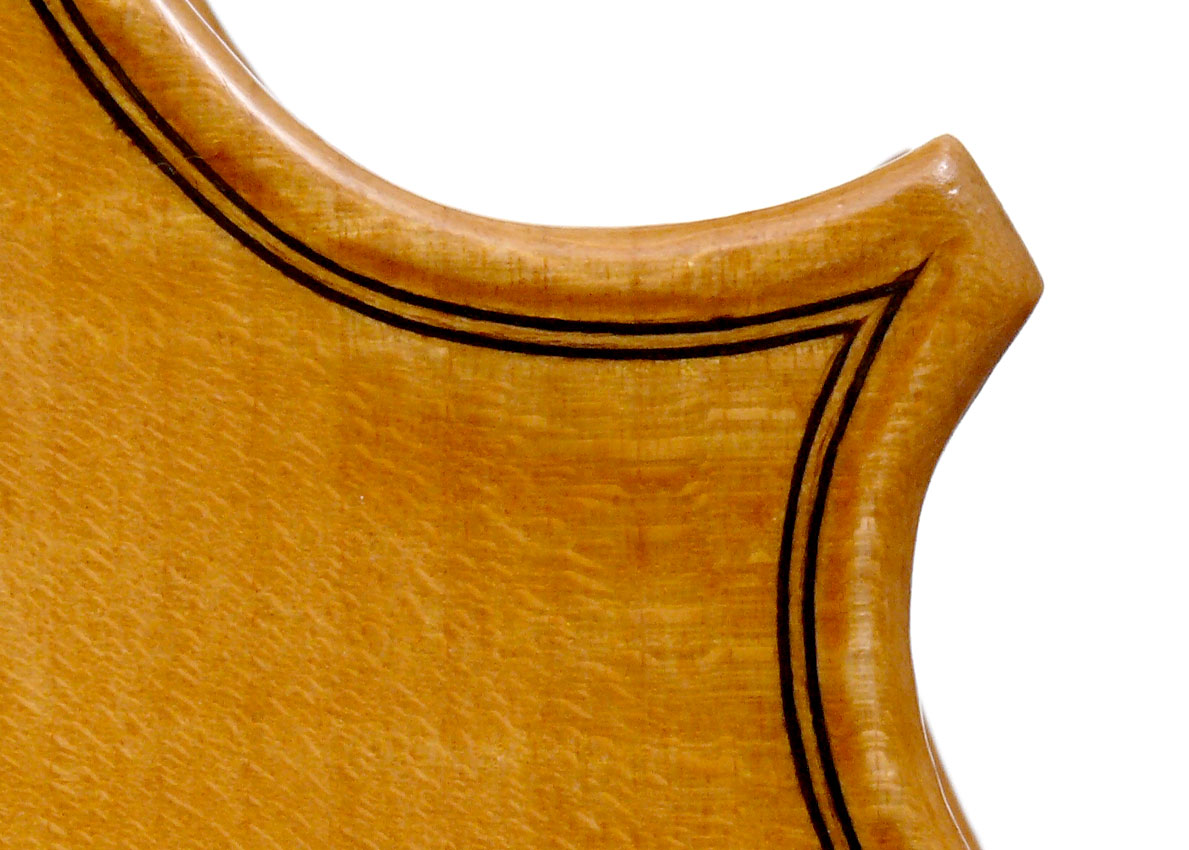 This viola is made of well-chosen and attractive materials - the maple used throughout is nicely figured with a straight and even medium curl producing a distinct flame. The top is of fine tone spruce with very straight medium grain. The oil-based varnish is of a very light-golden honey colour of high transparency, allowing for clear appreciation of the materials. The f-holes show elegance and refinement and the purfling is neatly traced with decent work in the corners.