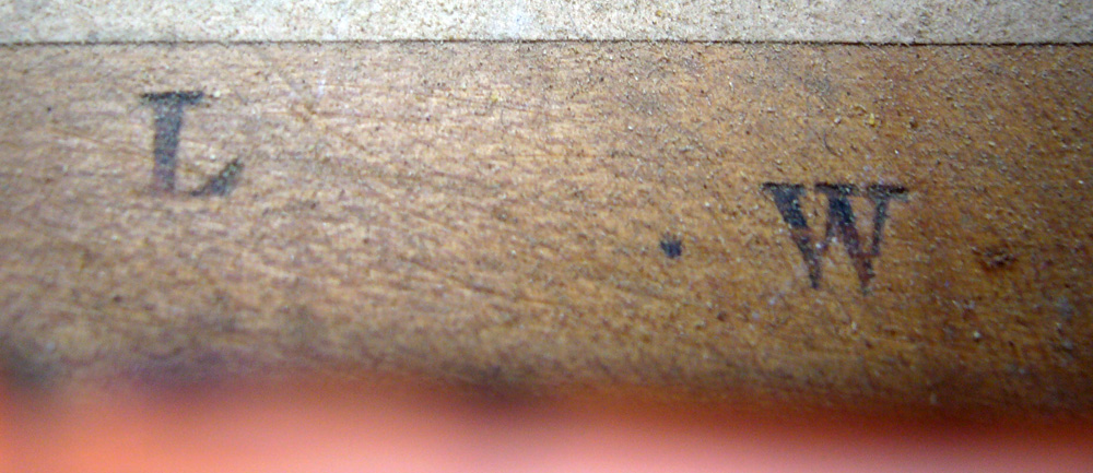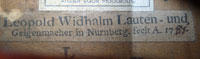 Whatever the case may be, this instrument also bears the two letters L. and W. branded into the back, just below the label - making this almost certainly the work of Leopold Widhalm senior, as stated by the certificate. That, furthermore, makes a strong case for the senior Widhalm's year of death being 1786 and not 1776, when he would have been merely 54.