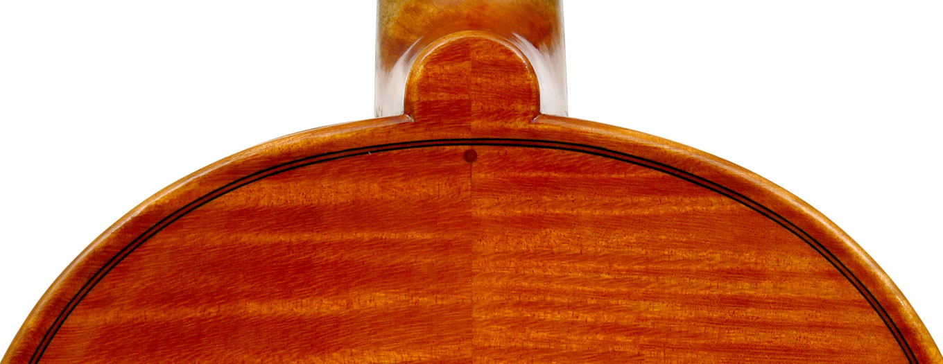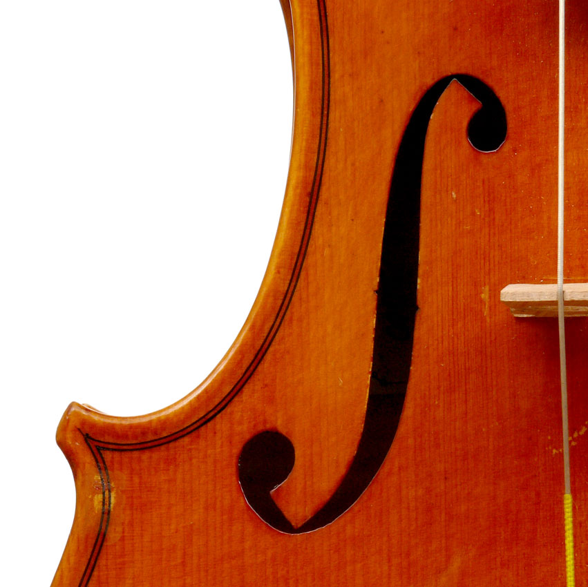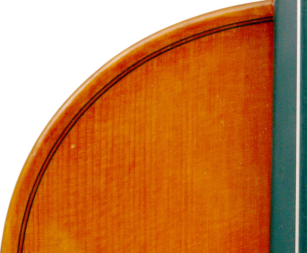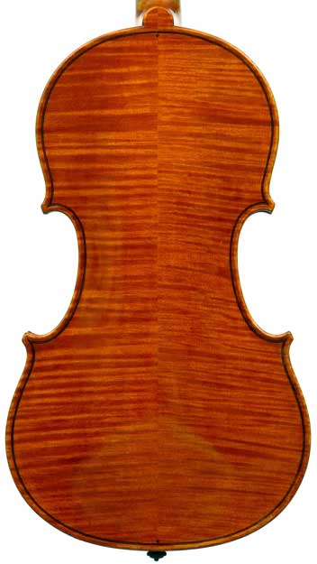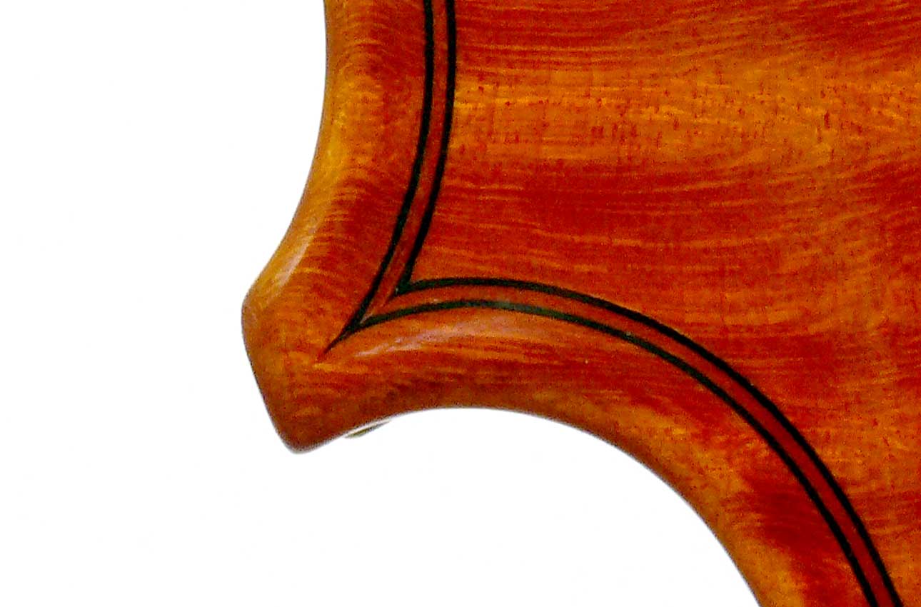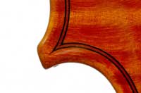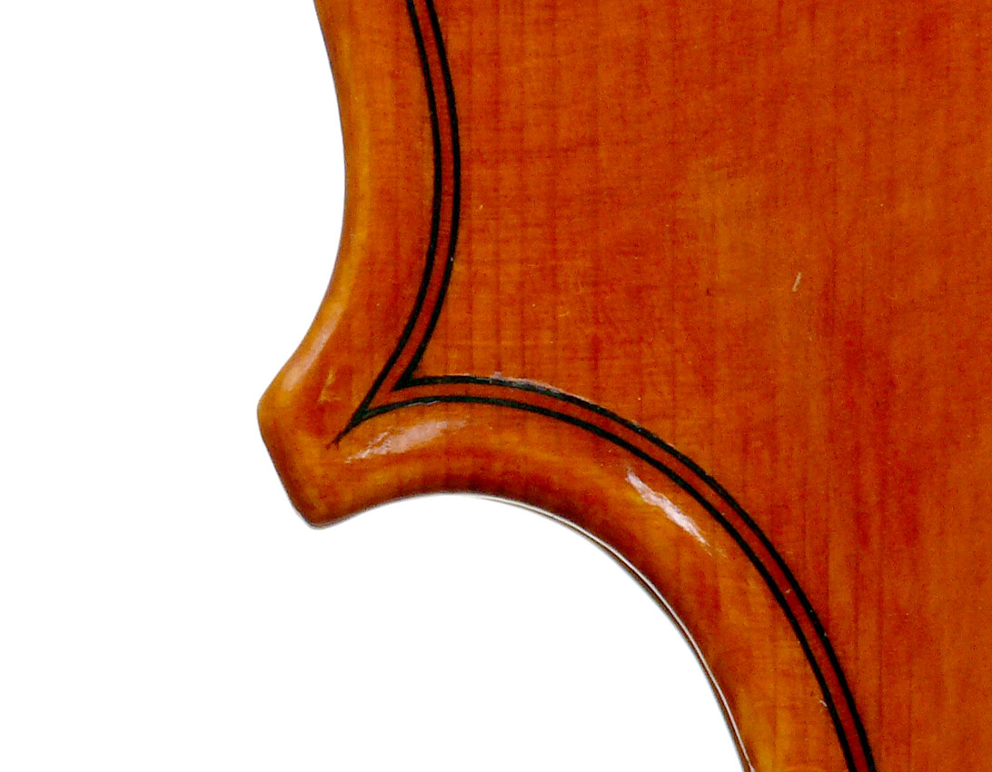 This violin has a particularly attractive back of richly flamed maple with a medium curl - the ribs, neck and scroll appear to be of the same well figured wood. Throughout the craftsmanship is refined and of a high order, particularly noticeable in the crisp tracing of purfling and tidy mitre work in the corners. It appears that it loosely follows the Guarneri model, at least as far as the f-holes are concerned.
