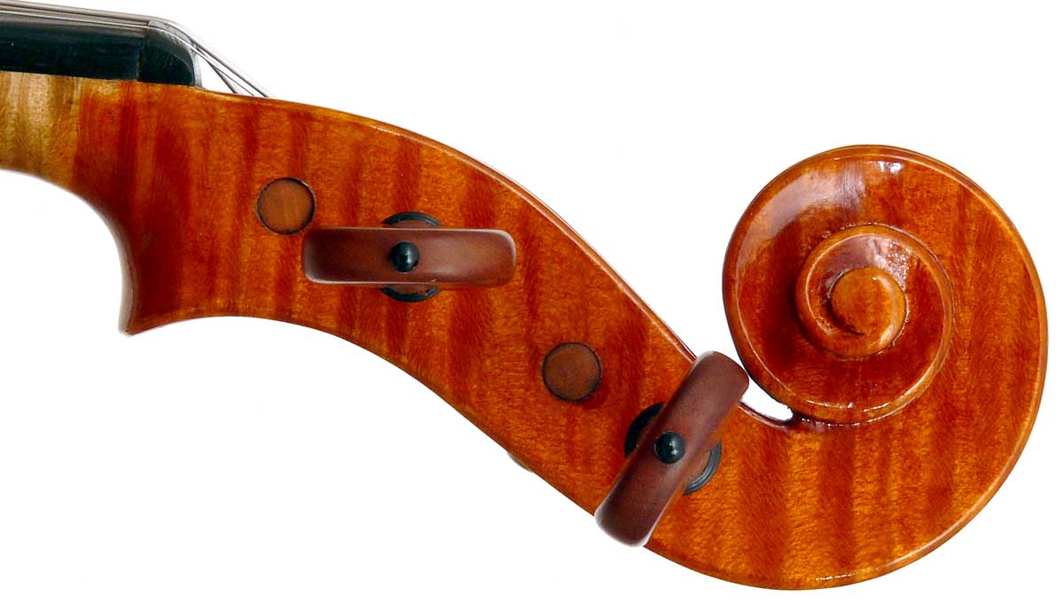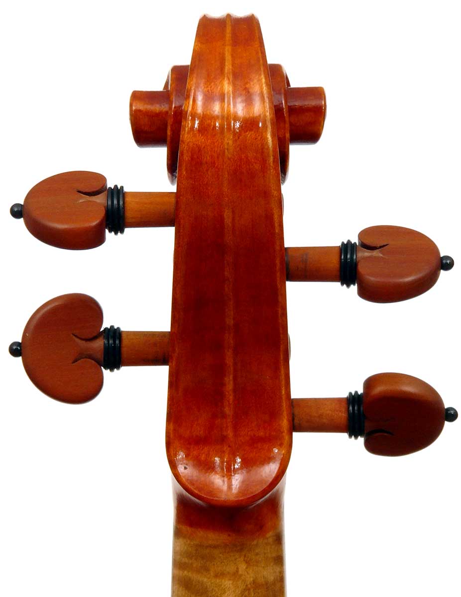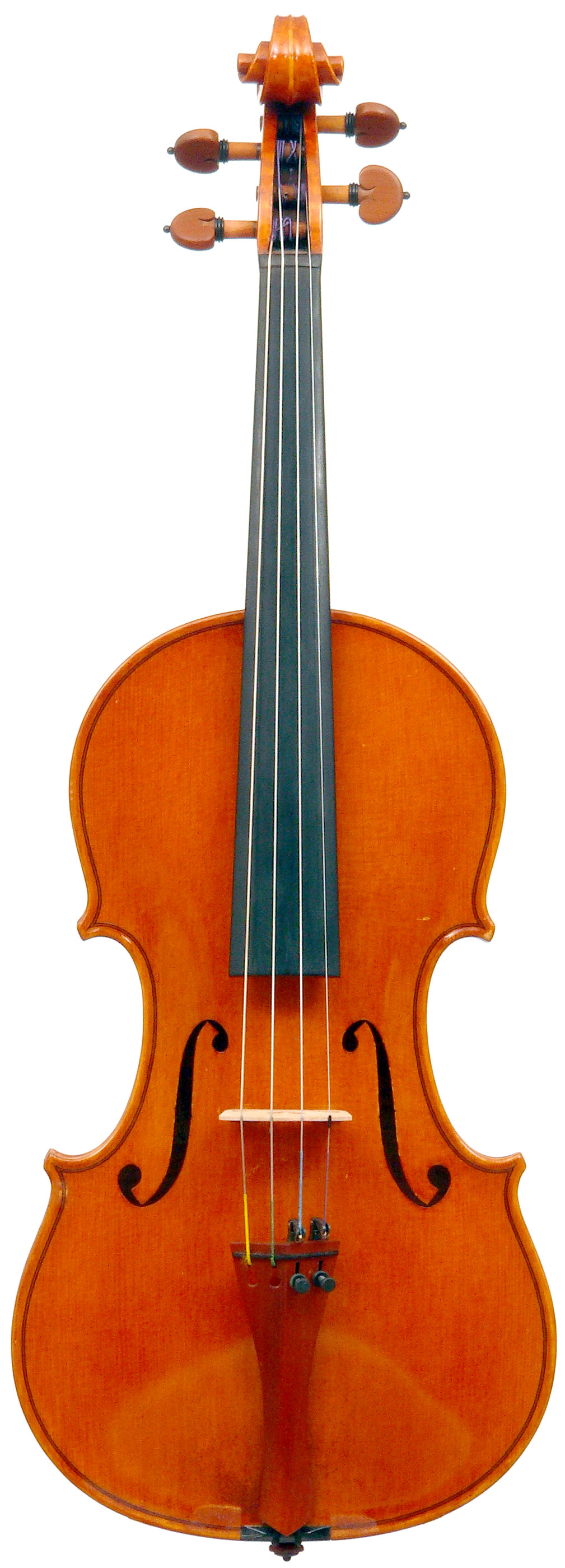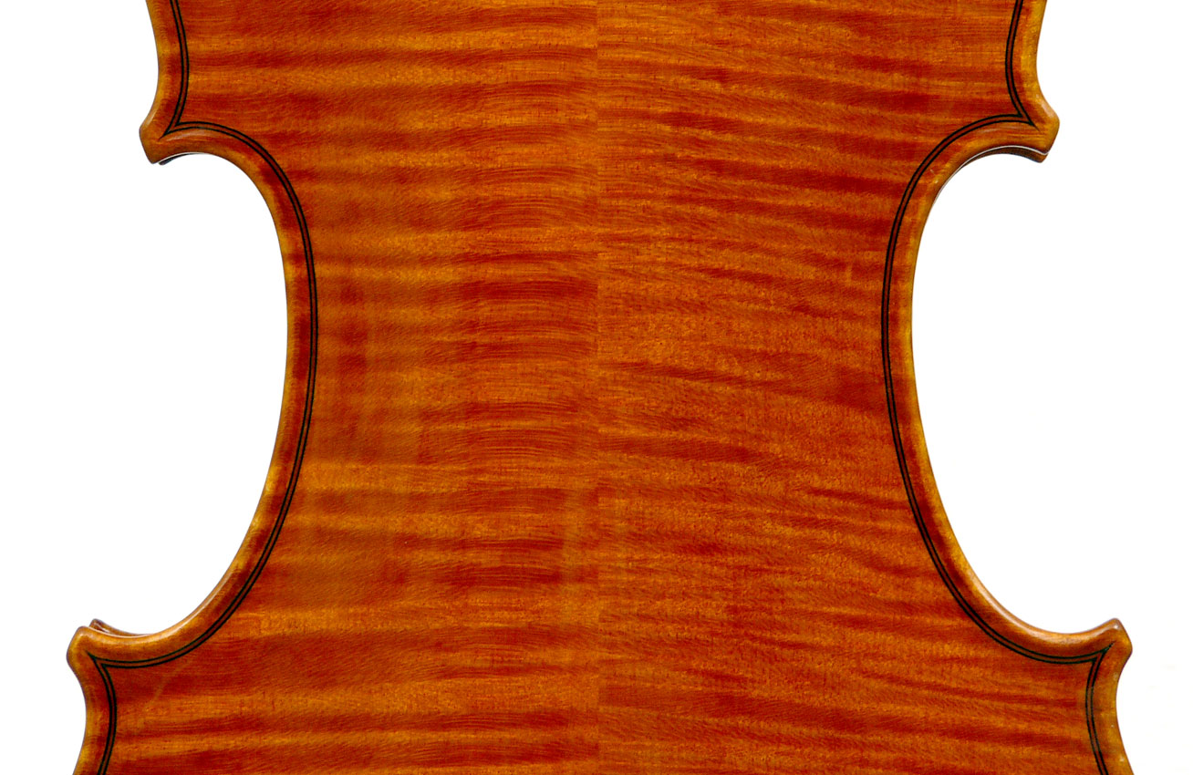 This violin has a particularly attractive back of richly flamed maple with a medium curl - the ribs, neck and scroll appear to be of the same well figured wood. Throughout the craftsmanship is refined and of a high order, particularly noticeable in the crisp tracing of purfling and tidy mitre work in the corners. It appears that it loosely follows the Guarneri model, at least as far as the f-holes are concerned.