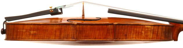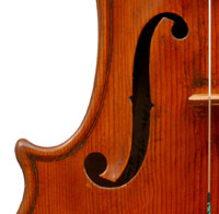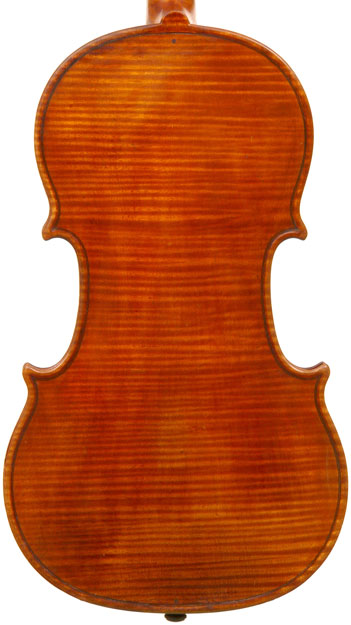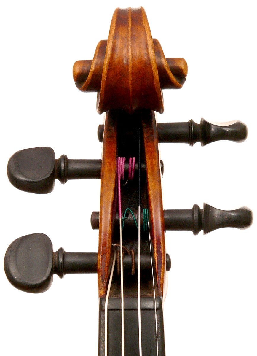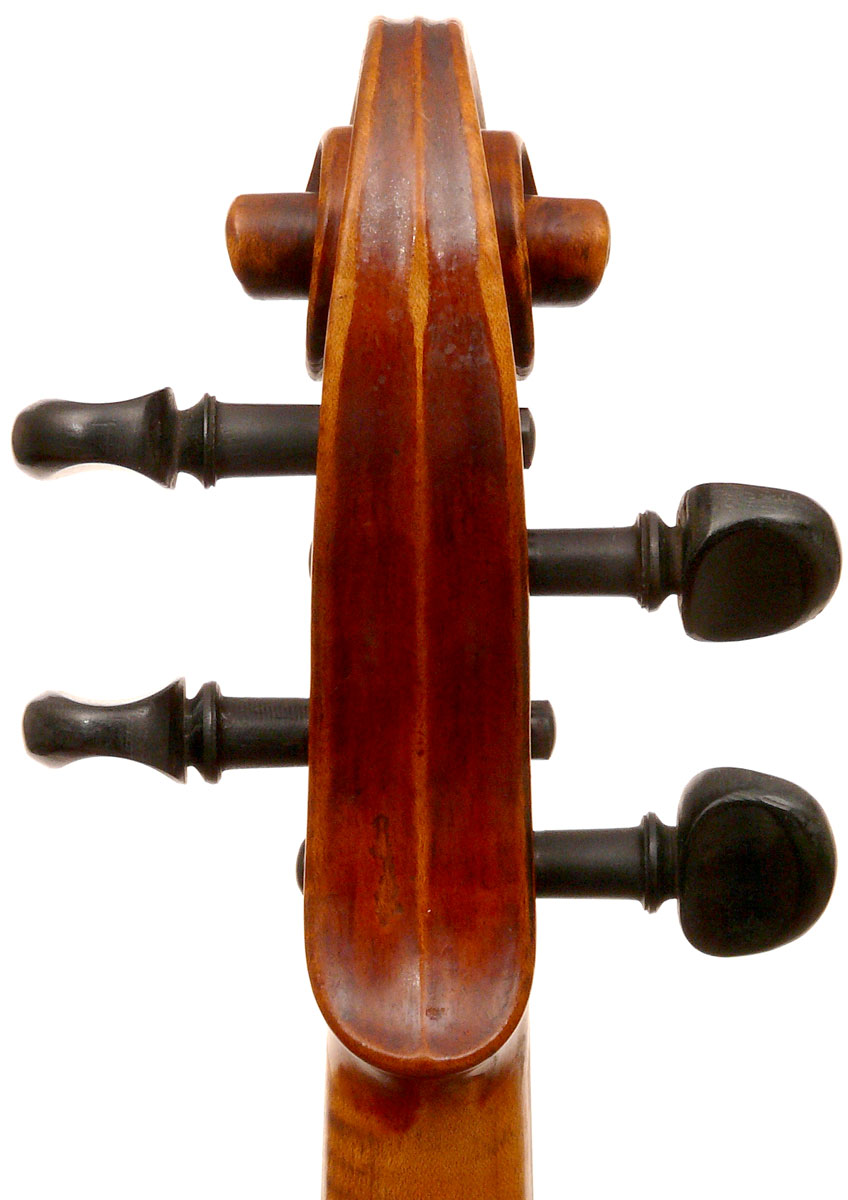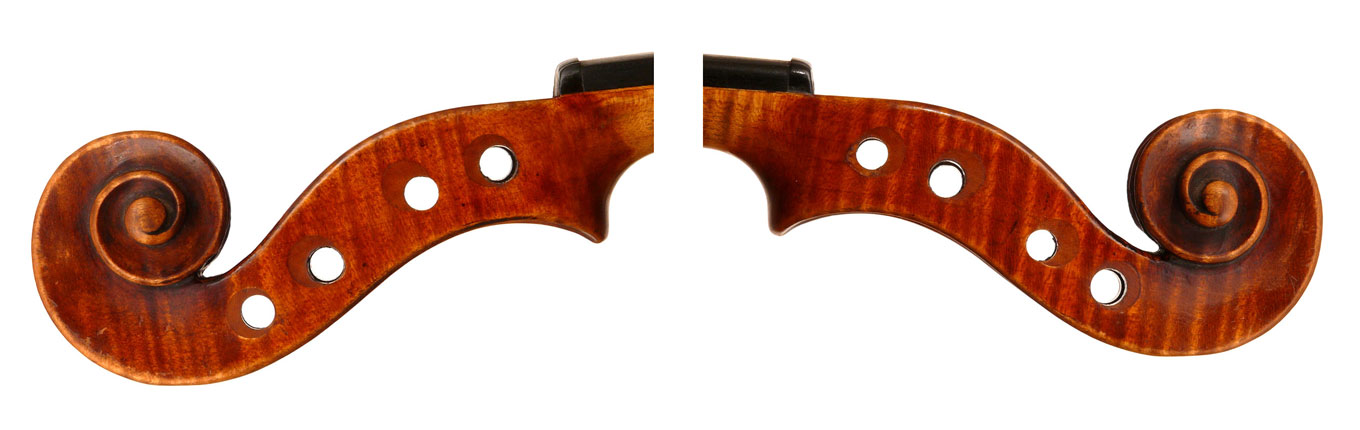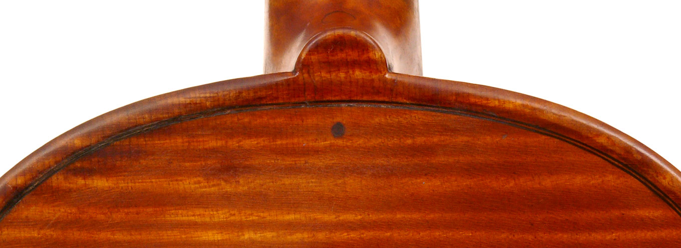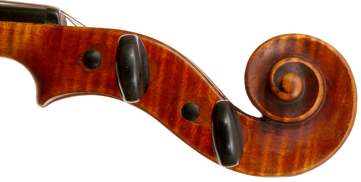 What strikes one in this violin is the beautiful one-piece back of nicely flamed maple with a distinct narrow curl running straight across the back. The edges are strong and the corners rounded and soft, rather than angular. The purfling is very well-traced. The scroll is really splendid, beautifully refined, strong and superbly balanced - the work of a master craftsman. There is no neck-graft and all the pegholes are bushed.