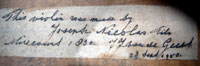A closer look at the identifiers in this violin underlines the fact that Joseph Nicolas' work is almost identical to that of his more illustrious and respected father, Didier Nicolas (1757 - 1833). The son succeeded his father around 1816. Whereas Vannes indicates that the son always branded his instruments, this violin bears no brand anywhere. However, what removes all doubt that this violin is the work of Joseph Nicolas Fils, is that it bears his known signature in ink in the back, next to the soundpost (see photo).