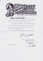 The Dutch violin maker and authority, J. J. van de Geest (1899 - 1974), identified this violin as the work of Joseph Nicolas Fils (1796 - 1864) from Mirecourt, made in 1830. Van de Geest was certainly qualified to make such an assertion, having been studio manager for George Hart & Son in London for 18 years until 1938, a period during which he established his reputation internationally as maker, restorer and authority on old instruments. The violin currently bears a 1950 handwritten label by Van de Geest giving the above attribution. A later accompanying certificate, dated 1952, affirms Van de Geest's attribution to Joseph Nicolas Fils.