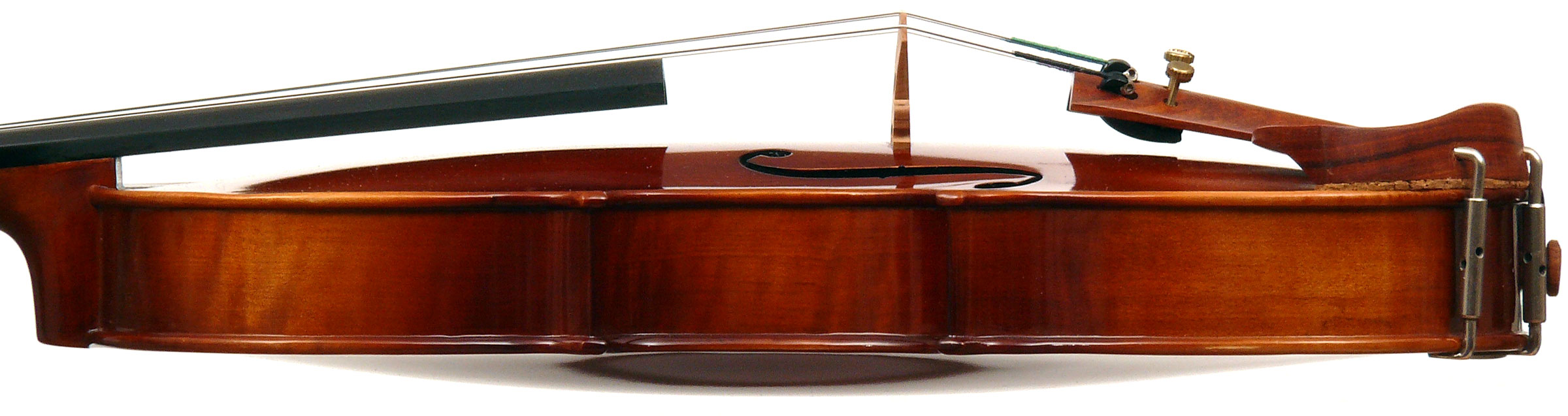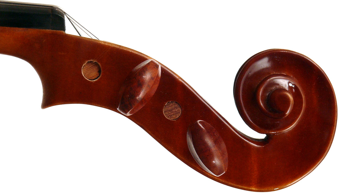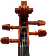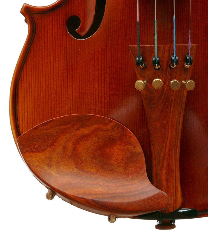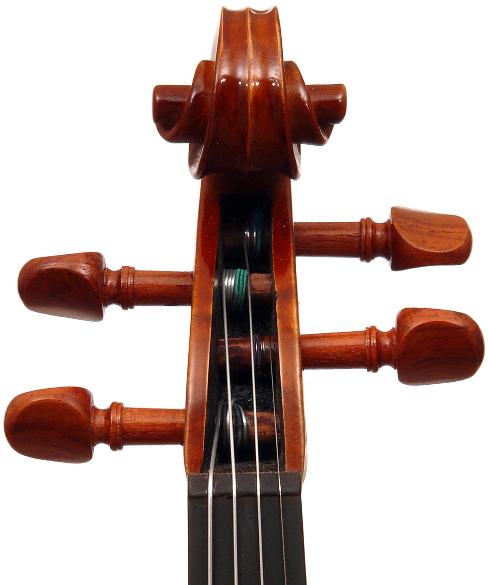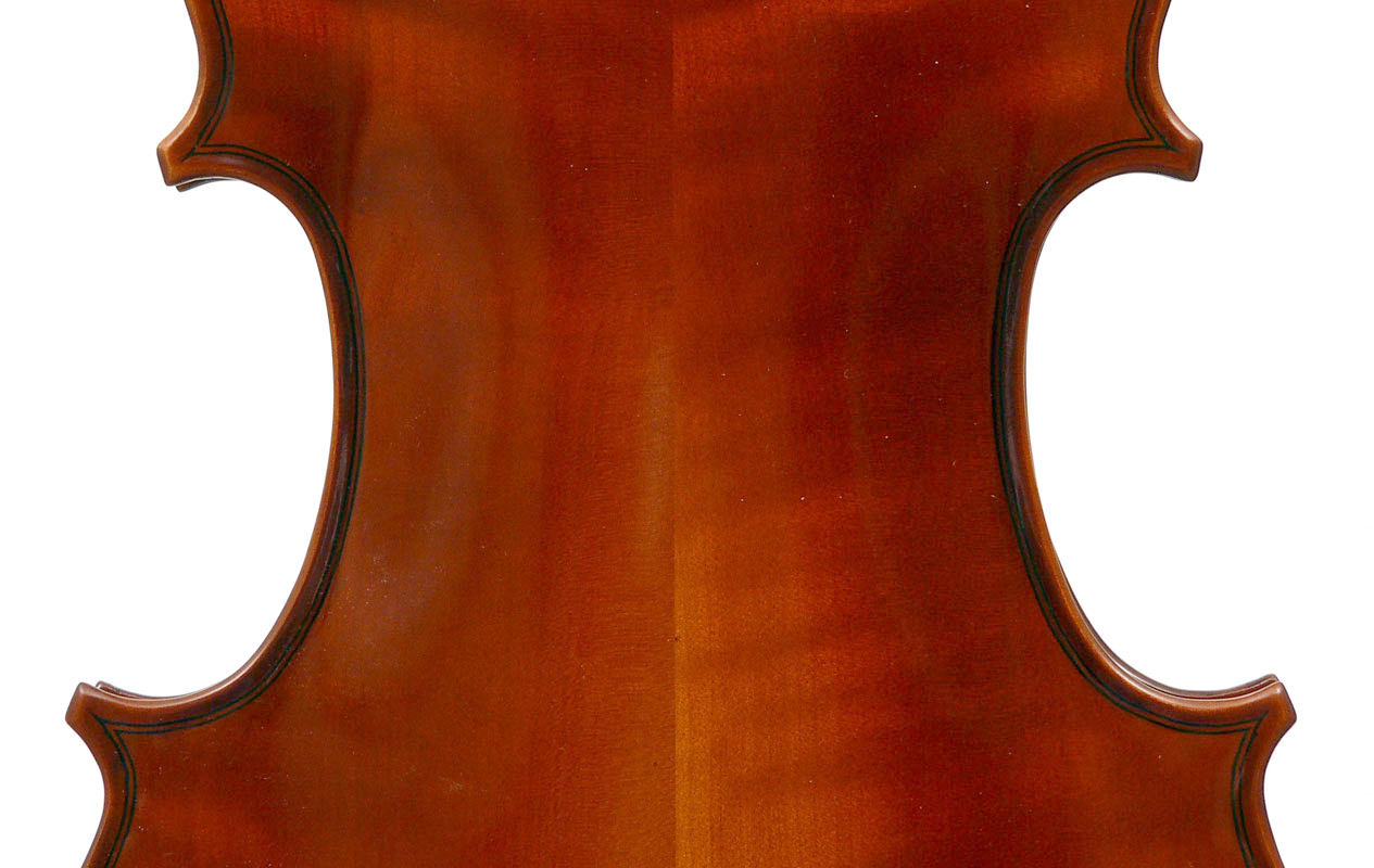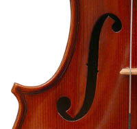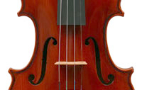 The materials are well chosen - the two-piece back and sides are consistently of good quality maple. The top is of good tone spruce, always with a clear attractive straight medium grain. It is the tidy work in the corner mitres, the neatly traced purfling and attention to detail in the f-holes that show the serious intent behind these instruments. No shortcuts are taken - for example, the insides are correctly crafted, fully blocked and lined with a fitted bass bar. The bridge is by Despiaux - a top French brand. The Guarneri-type chinrest and pegs are of a very attractive rosewood. The tailpiece has been replaced since these photos were taken and is now of a black student type with built-in bronze adjusters.