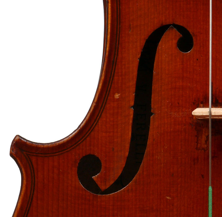This French violin bears a label with the name J. V. Ferelli on it, and two handwritten dates - 1931 and 1908. J. V. Ferelli was a generic label used by the Mirecourt-based firm of Laberte & Magnié between 1910 and 1940 (according to Baxter). The Laberte firm was established in 1790 by an ancestor of Marc Laberte (b. 1880) Henley however points out that Laberte's amalgamation with the Fourier-Magnié firm only happened in 1925, so this label came in to use only from that time onwards, hence this violin was likely made after 1925, probably in 1931, as shown by the handwritten date in it. What the 1908 in it stands for is anyone's guess.