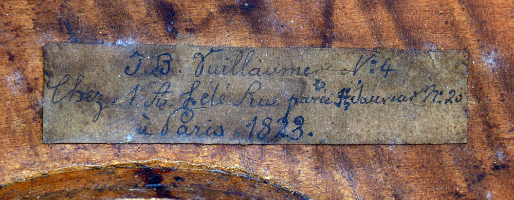 The violin has a carefully made handwritten label - a meticulous copy of the label in J. B. Vuillaume's 1823 violin number 4 (photo), but since this violin simply doesn't look much like the master's work and since JBV's fourth violin is currently catalogued, photographed, documented and in private ownership, this violin is manifestly not his work. Furthermore, a fake neck graft cut into the neck makes it an unlikely candidate for a high-end authorship. However, it is genuinely old as is manifested in the wear between the wintergrowth lines in the edges, and the wear of the corners and scroll - 1840 is a fair estimate.
