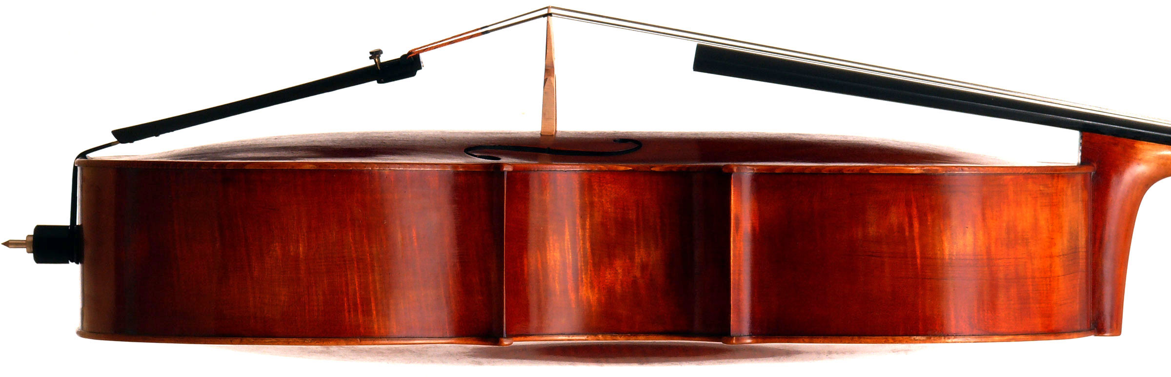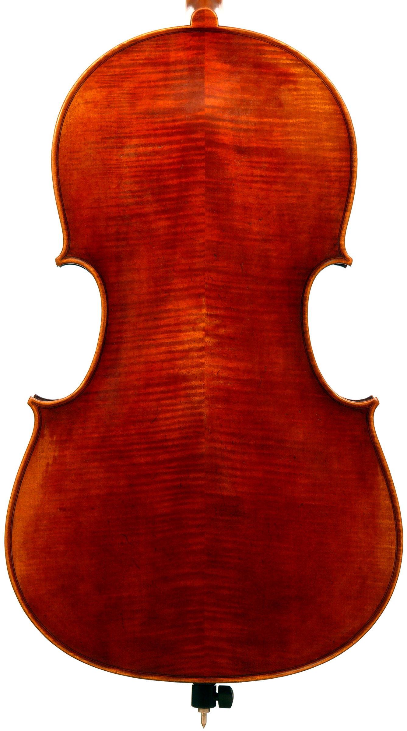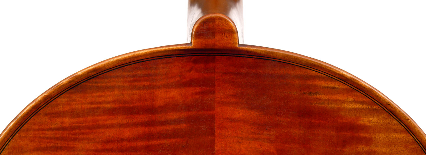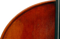 Rather than following the Stradivari model, this cello is loosely based on the Montagnana pattern - preferred by many cellists for its wider structure which has been associated with richer and deeper sonority. The instrument has also been antiqued to have the appearance of an 18th century cello - very nicely done and very much a norm in lutherie today, to the extent that antiquing is a requirement in some international violinmaking competitions such as the Violin Society of America Competition.