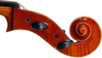 The two-piece back and sides are of well-flamed maple with an irregular mild medium curl that truly appeals. Material for the top is unusually well-chosen - an attractive finely grained tone spruce of slow growth, with narrow winter growth in the centre widening to the flanks. The neck and scroll are of lesser flamed material. The deep red-brown varnish is based on a French recipe and beautifully compliments the wood, adding a rich lustre to the appearance.