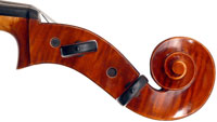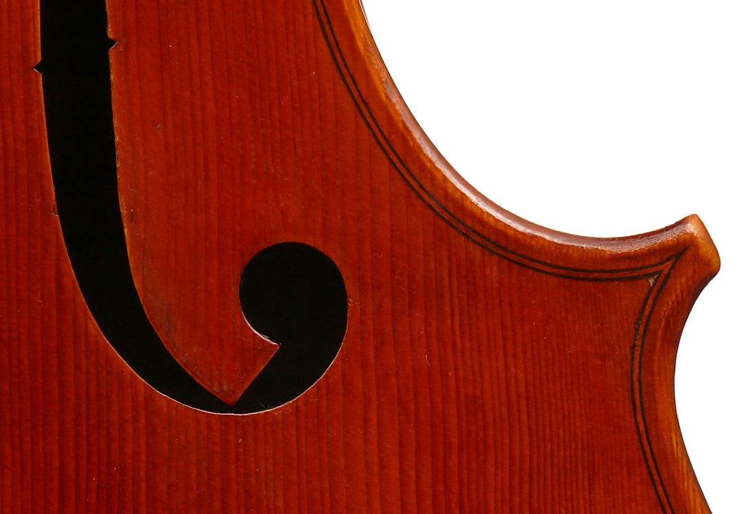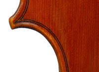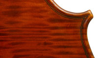 The two-piece back and sides are of well-flamed maple with an irregular distinct medium curl with good visual impact. The top is of attractive medium-grained tone spruce of fairly open growth lines and the scroll wood is nicely figured. The golden brown varnish is based on a French recipe and compliments the wood nicely. This instrument shows very tidy work and attention to detail - throughout it gives evidence of experienced craftsmanship and a steady hand.