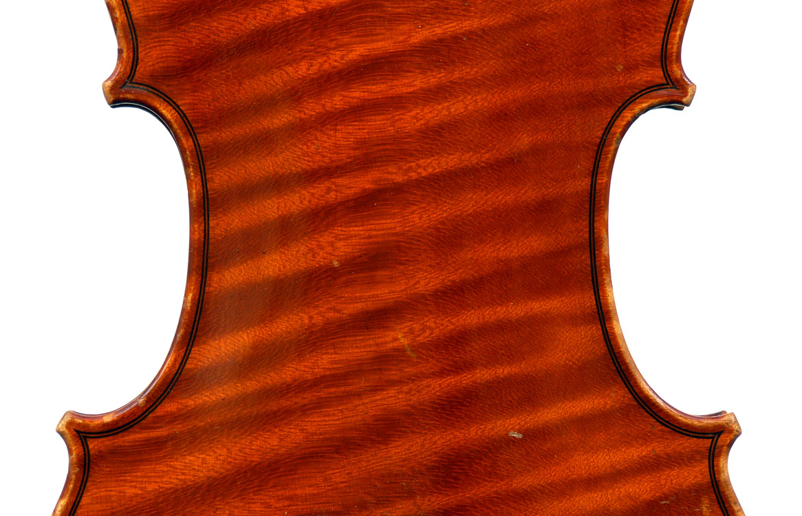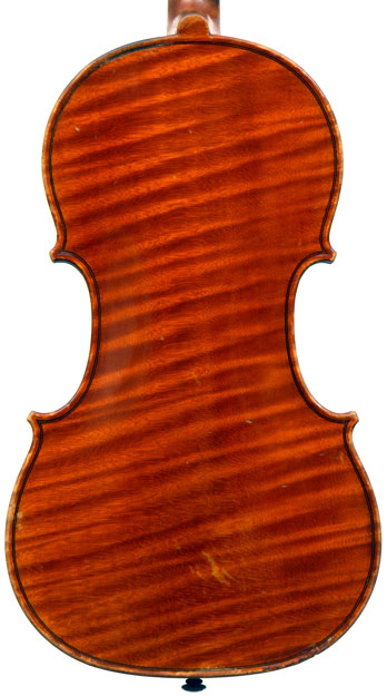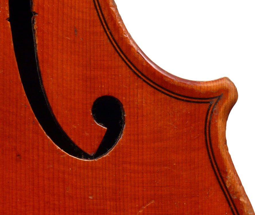 This is a good instrument in all respects. It dates from around 1930 and is in impeccable structural condition. It has a really beautiful one-piece back with distinct flame of broad curl. It follows the Guraneri model quite directly and manifests a steady hand in all aspects of fine lutherie, notably very tidy work in the purfling and corners.