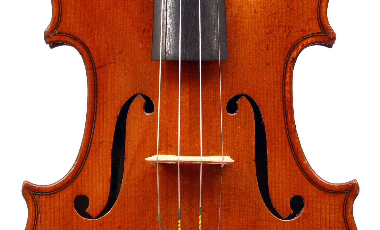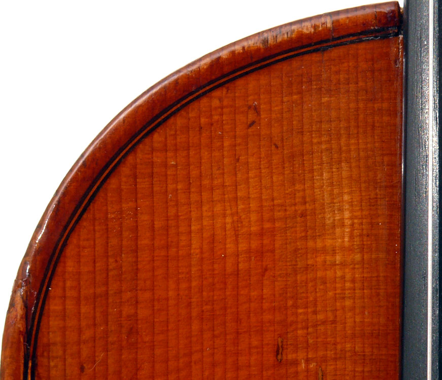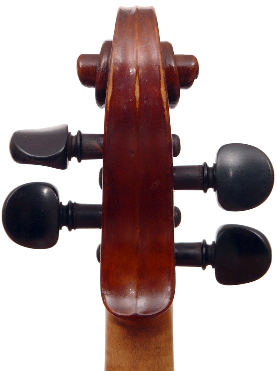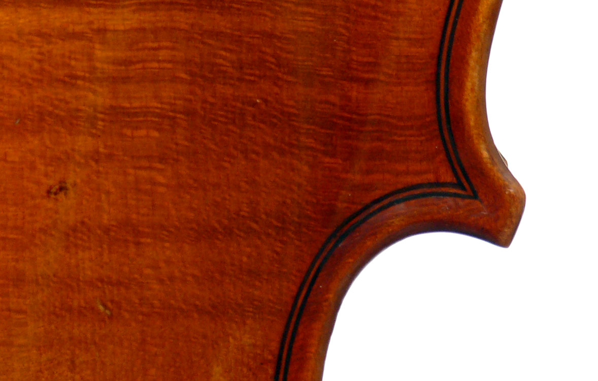 This violin has immediate visual appeal - it's an attractive instrument made of handsome materials, well made and in good condition. The two-piece back is of good maple of a straight medium curl and mild flame. The ribs deviate from the norm of wood matching the back and using the same wood for all the ribs sections all the way round, inasmuch as different unmatched pieces are used for different sections. This is itself has no tonal implications but points at the traditional giving way to the perfunctory and may have a bearing on the violin's authorship. The top is of excellent tone-spruce of fairly open grain, widening to the flanks. The neck and scroll are less flamed, the purfling somewhat ponderous, but the cornerwork is very neat.