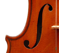 It should be mentioned that a repair has been done to a bass bar crack in this violin. In this case the repair makes use of a piece thin fabric glued across the entire inner surface of the violin's top, lining it from edge to edge. The use of fabric as a stabilizer instead of the traditional wooden cleats is highly unorthodox and the jury is still out on the pros and cons. But it's certain that more established violin makers shy away from the used of fabric for repairs, except in certain cases of repairs to ribs, particularly in cellos. In this case the violin has undergone superb French polishing which renders the crack almost invisible.