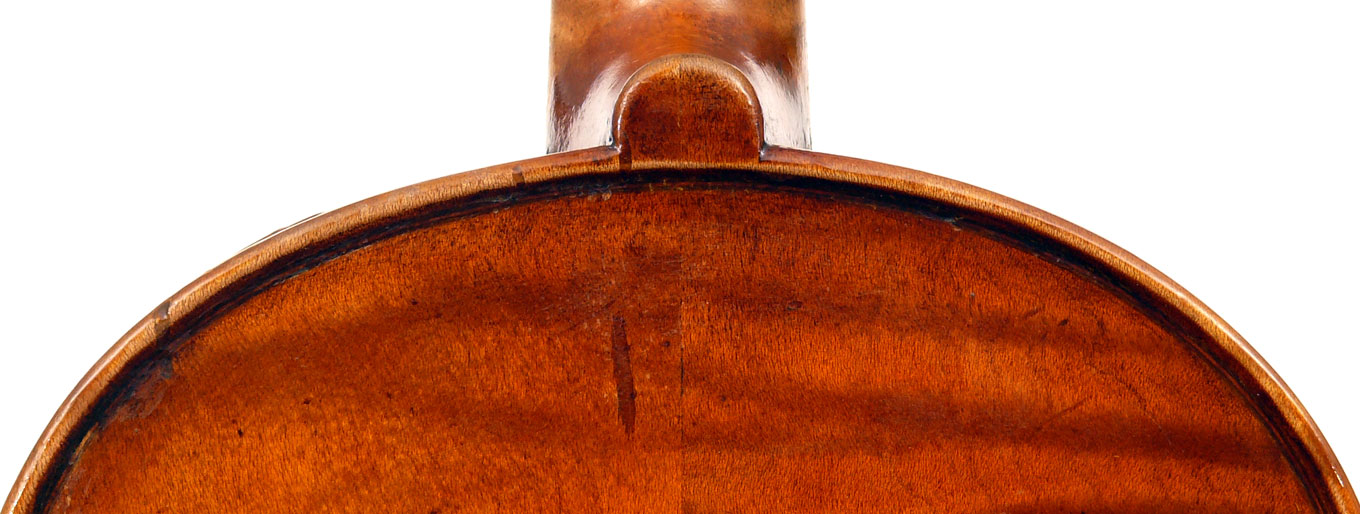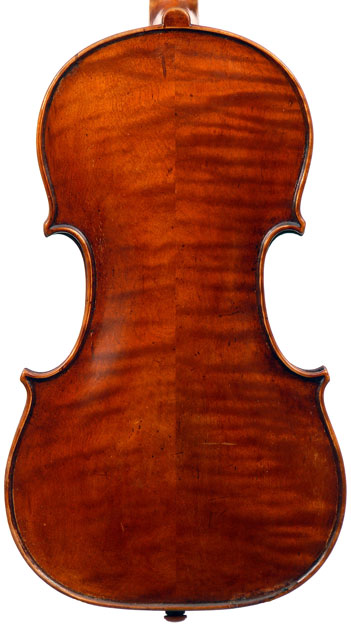 The two-piece back is unassuming but nevertheless of subtle charm, made of mildly and unevenly flamed maple with a broad curl. It appears that the same wood was used in the sides, neck and scroll. The top is of superb tone spruce with very straight and even growth lines, very closed on the centre seam and opening more to the flanks. There is great attention to detail in the Fs, purfling and corners, with the Fs being crisp and tidy and the palettes nicely fluted - a sign of good workmanship. The finish on the inside is clean and correct. The scroll is elegant, almost feminine and well-balanced. The varnish in the top is a nice golden brown with a tinge of red. In the back, sides and scroll the reddishness predominates. The varnish is highly transparent, complimenting the beauty of the materials, particularly in the front. This instrument is in very good condition.