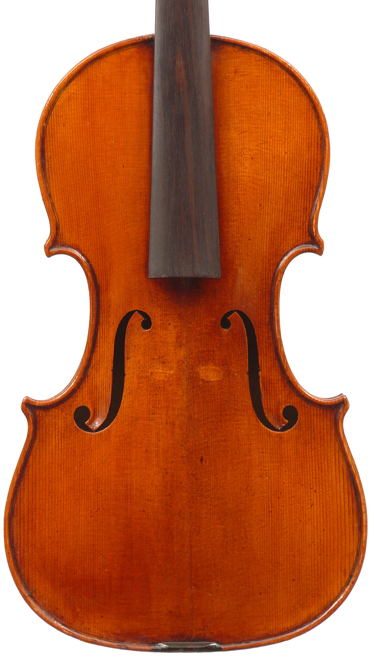 This violin is unlabelled and undated, but seems to be of German origin from around 1920 to 1930. It follows the Stradivari pattern closely and in general appearance seems to have been intended as a deliberately copy of the master's work. It is really attractive and nicely made of appealing materials. It represents high-end German trade work but of unknown origin.
