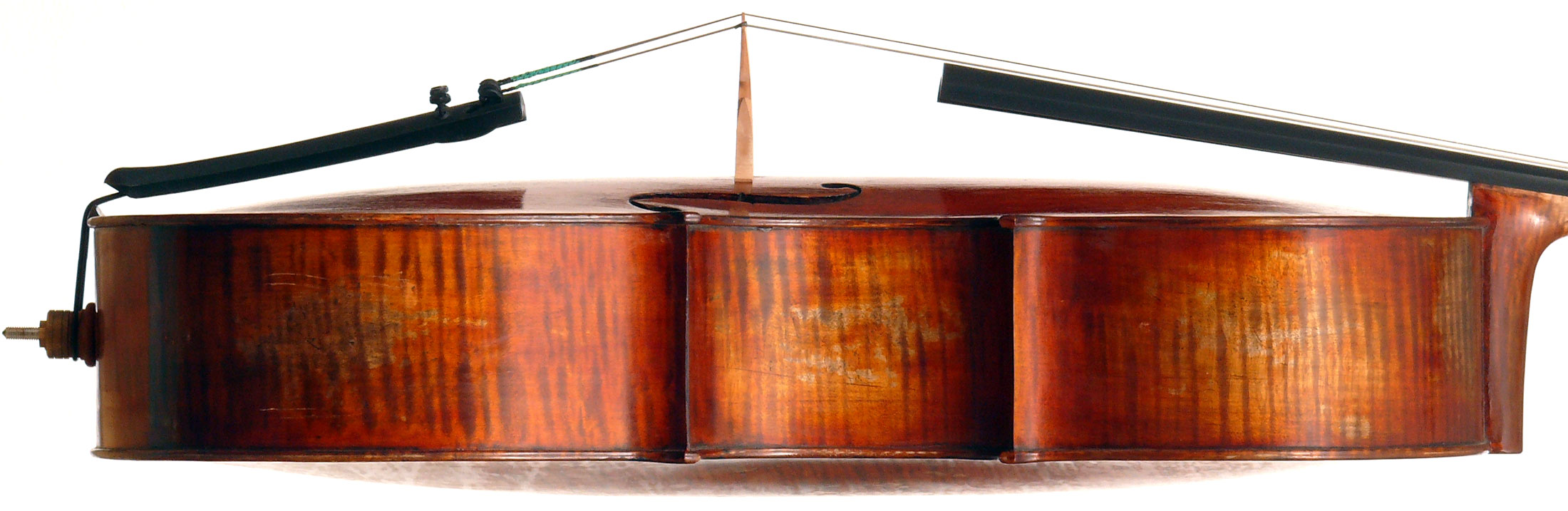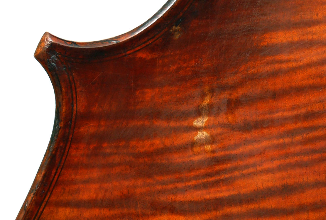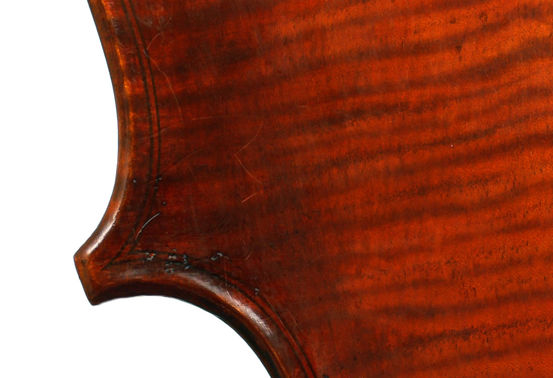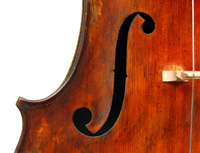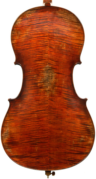 This cello has superb tonal properties suitable for solo work. It is fully compliant with professional requirements - evenly balanced throughout and speaking with openness and responsiveness, easy to play on. The materials are well chosen - the sides appear to be matched with the wood of the beautiful two-piece back, showing attention to detail and to the traditions of good lutherie. Workmanship is very good throughout - tidy work in the corners and purfling neatly traced. Varnish is an amber to dark red-brown oil-based application over a yellow ground that altogether really nicely compliments the wood.