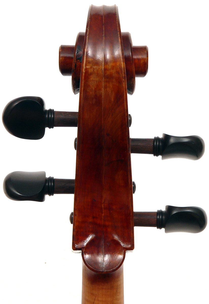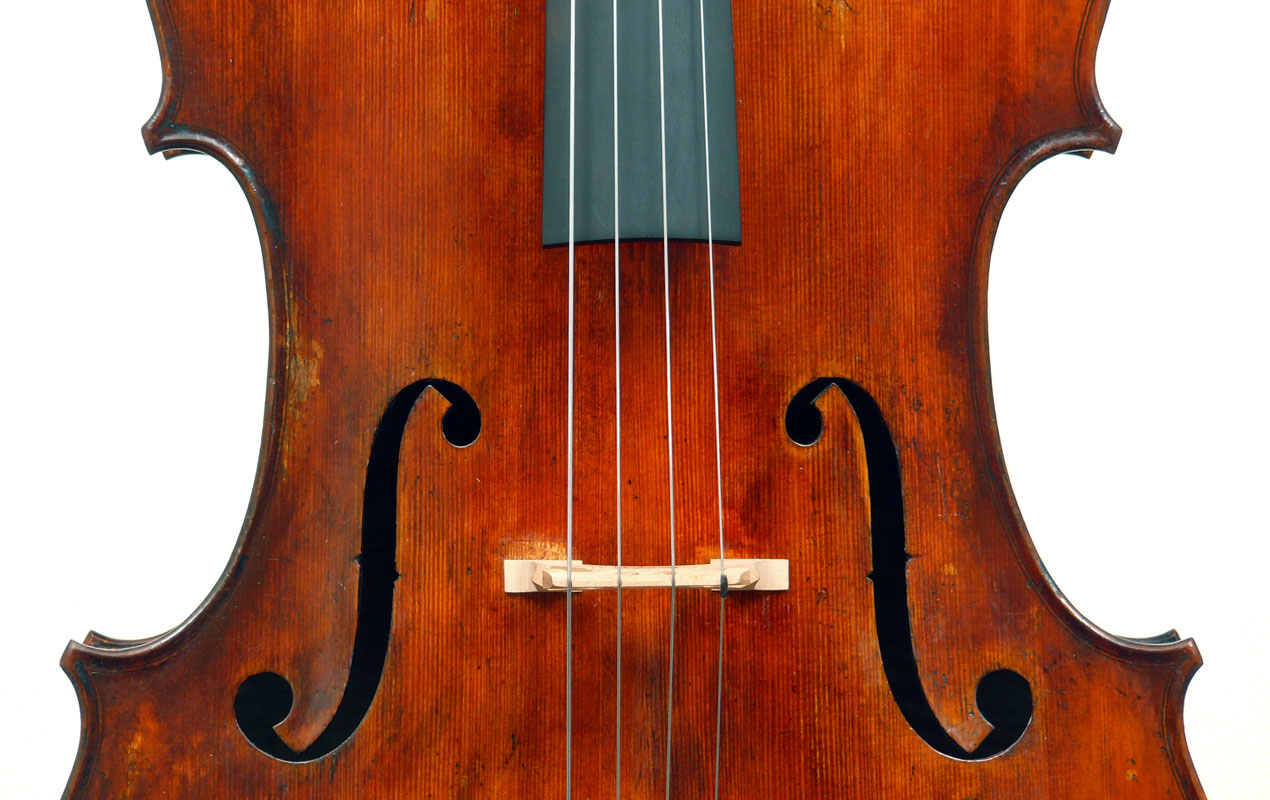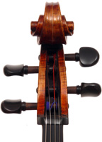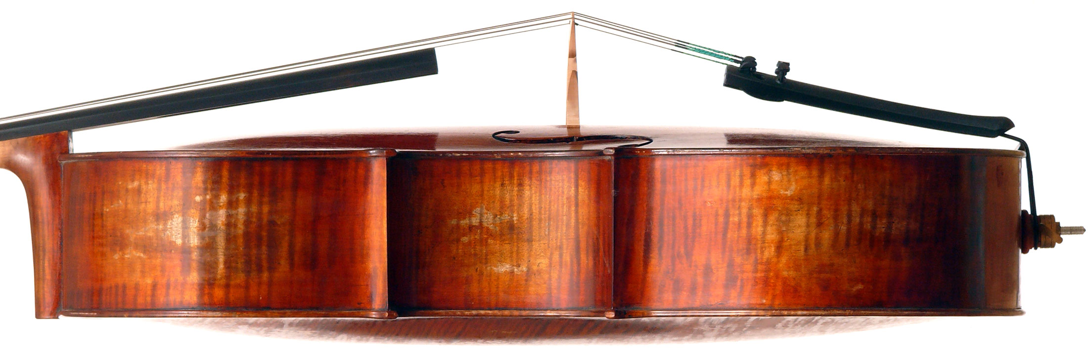 This cello has superb tonal properties suitable for solo work. It is fully compliant with professional requirements - evenly balanced throughout and speaking with openness and responsiveness, easy to play on. The materials are well chosen - the sides appear to be matched with the wood of the beautiful two-piece back, showing attention to detail and to the traditions of good lutherie. Workmanship is very good throughout - tidy work in the corners and purfling neatly traced. Varnish is an amber to dark red-brown oil-based application over a yellow ground that altogether really nicely compliments the wood.