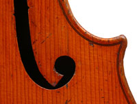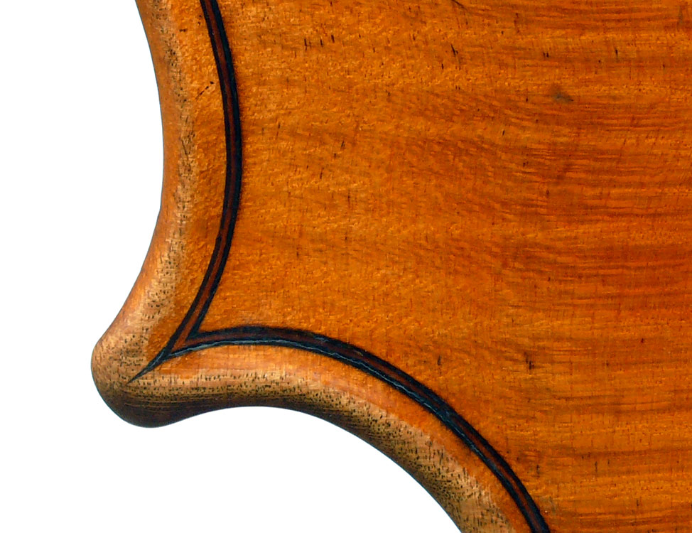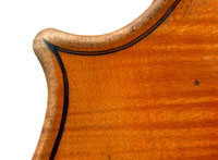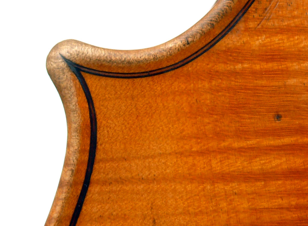The most striking feature of this beautiful instrument is its exceptionally attractive one piece back of well-figured maple with a narrow curl, repeated in the sides - evidently from the same tree.
