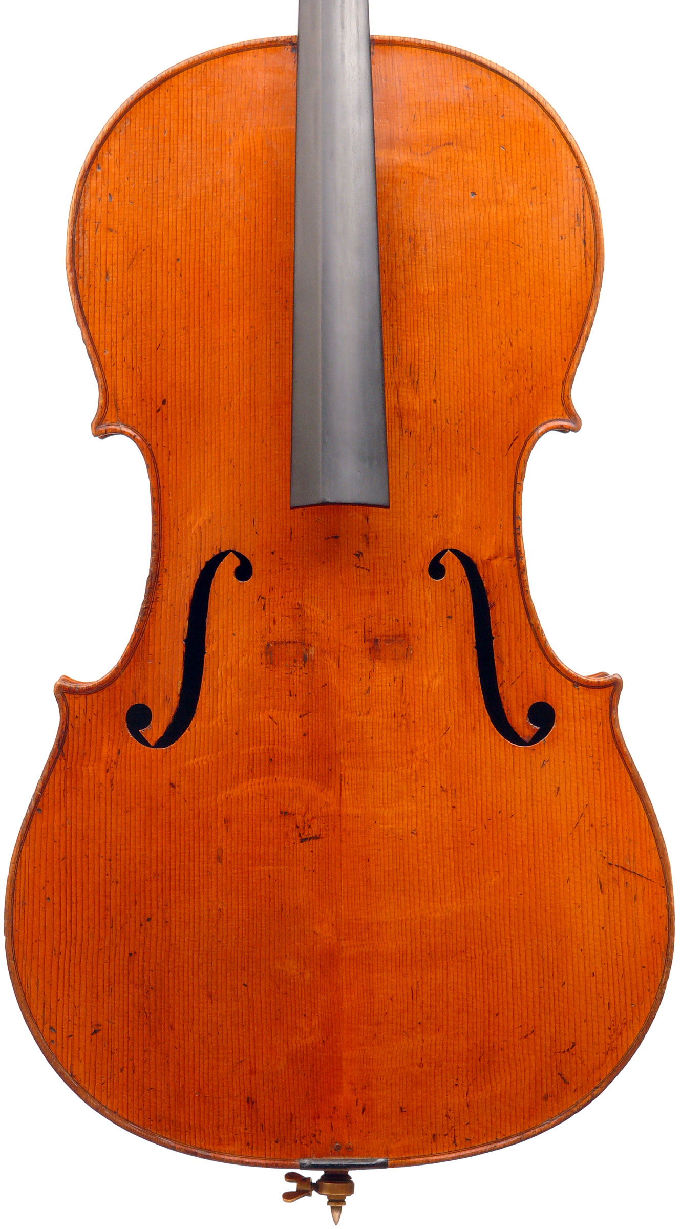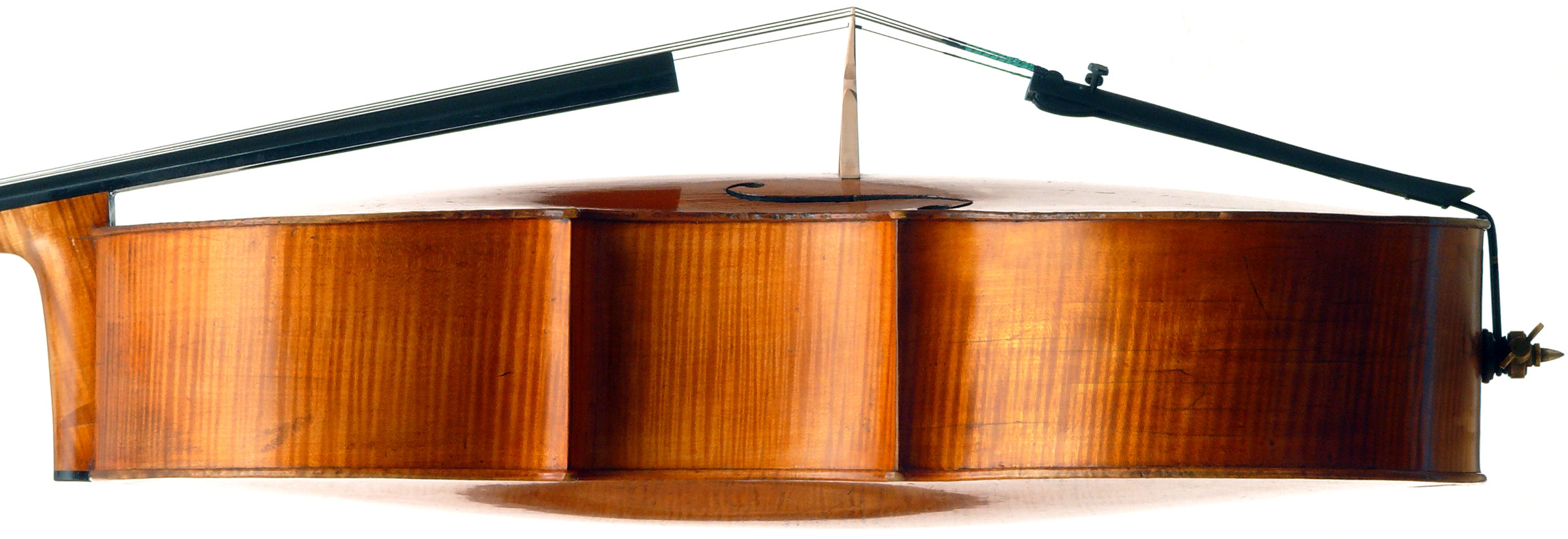 This cello was recently fitted with a new Belgian bridge and currently has Evah Pirazzi strings on it. However, it has a very old-style end-pin, which adds to its charm.
