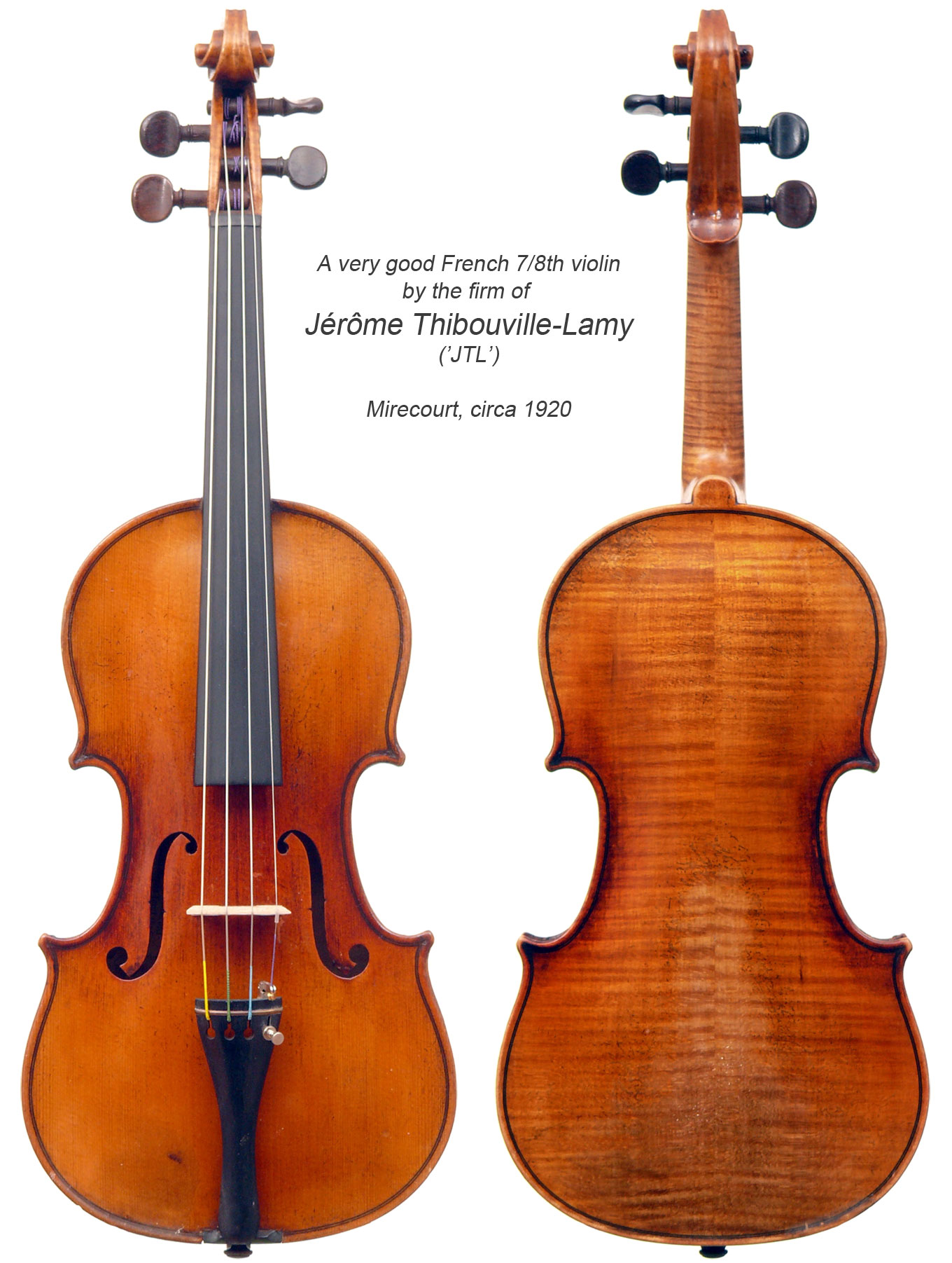 In 1880 JTL's annual production was 800 violins, 400 violas and 50 cellos, produced in three distinct grades, which were affordable alternatives to expensive fine violins, and which brought good violins into the hands of many excellent but less privileged young musicians. The JTL firm was still operating in 1930, maintaining its same high standards. Their productions were always good - well-made solid instruments of excellent materials and with good tone. I have not yet seen a JTL instrument that was not appealing to the eye - the backs usually are very attractive and the varnish pleasing.