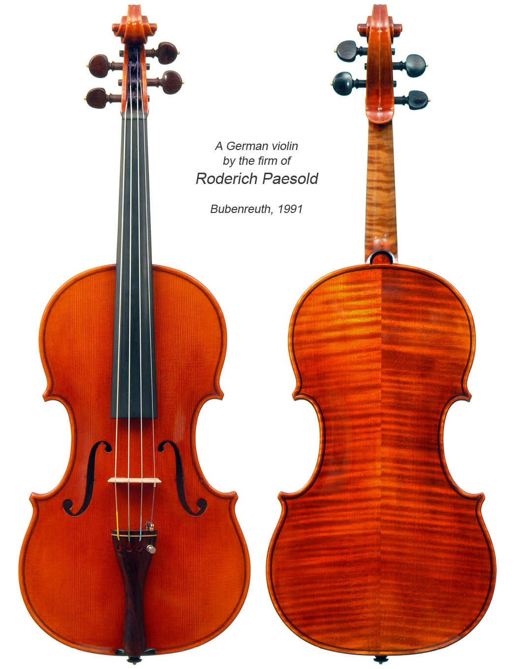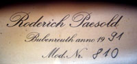 This very attractive violin with it's impeccable finish and attention to detail bears the label of the German firm of Roderich Paesold and is dated 1991.