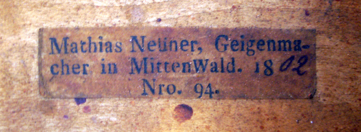 As with other German violinmaking dynasties such as the Klotz, Pfretzschner and Schuster families, the Neuner family mostly operated large studios where various members of the family and other craftsmen and apprentices contributed to the making of the instruments, which then eventually would be labelled with a label of the main studio owner or maker in charge of the business. Such labels were used somewhat casually, often identifying the workshop rather than the actual maker. This makes it difficult - if not impossible - to identify in an instrument the hand of a specific maker, although of course it is perfectly possible that an instrument may have been made by the individual named in the label. It is too simplistic to assume that an instrument is authored as stated in the label, which betrays ignorance of how those workshops operated. Any attribution or certification of such instruments is contingent on the examination by a top authority, of which in South Africa, there are none.