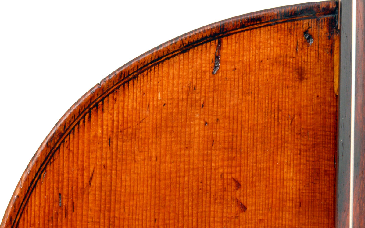 This instrument has had many repairs. Instead of discussing each individually, suffice it to say that this cello was subject of a large-scale in-depth restoration over the past two years. I went to a lot of trouble to verify each repair and can assert that the work was done thoroughly and correctly and that the cello is structurally perfectly secure. Especially noteworthy is that the crack in the rib around the lower bout (treble side) has been reinforced for its entire length with a strip of wood on the inside, heat-bent to cover the crack perfectly. Also, the shim (wedge) under the fingerboard appears to have been the best option rather than removing and resetting the neck, which would have engendered other problems. This wedge serves as more than simply raising the elevation, but rather makes for a restructuring and reinforcement of the neck itself - quite ingenious. Lastly, the brand new fingerboard is perfectly graded - all round good work.