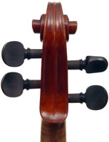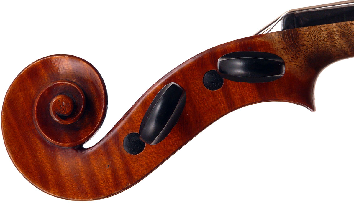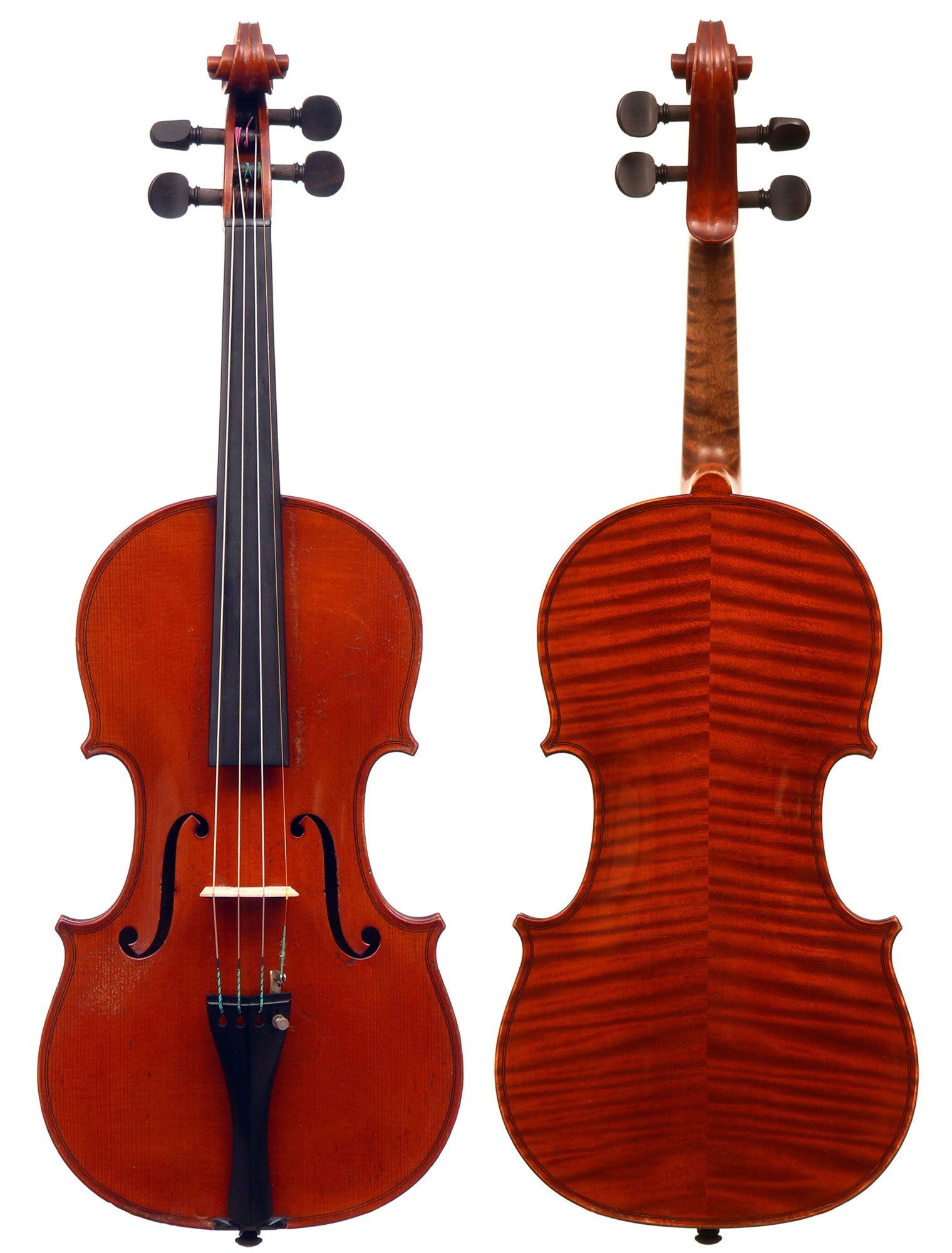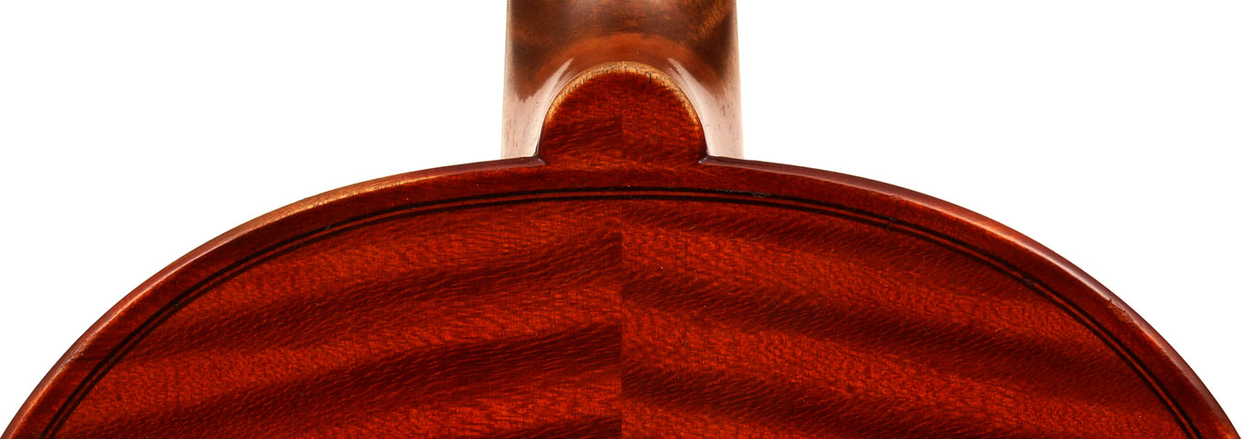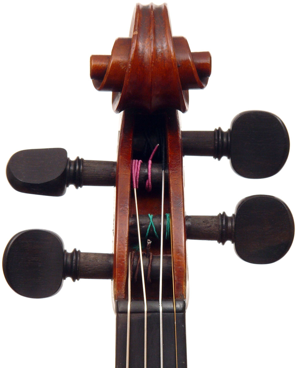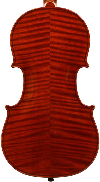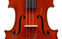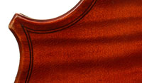 What strikes one immediately of this violin is the attractive choice of materials - the two-piece back, ribs, neck and scroll are of well-figured maple with a distinct deep flame of medium curl. The top is of good closely grained tone spruce. Purfling and particularly the cornerwork and mitres are exceptionally tidy. The reddish-brown varnish is unusually transparent, allowing the wood the be shown off well.