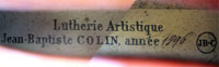There was no individual violin maker named Jean-Baptiste Colin, at least not in standard violinmaking literature. Labels bearing this name are associated with high-end French trade instruments made in Mirecourt, according to William Henley. (History has known a maker named Jean Colin, but he worked during the 18th century and this is manifestly not his work.)