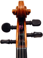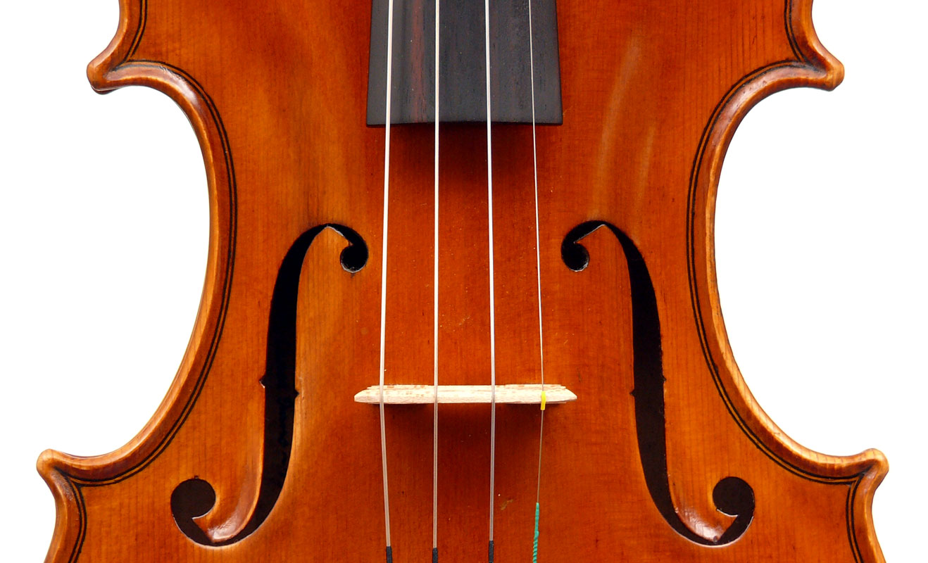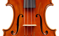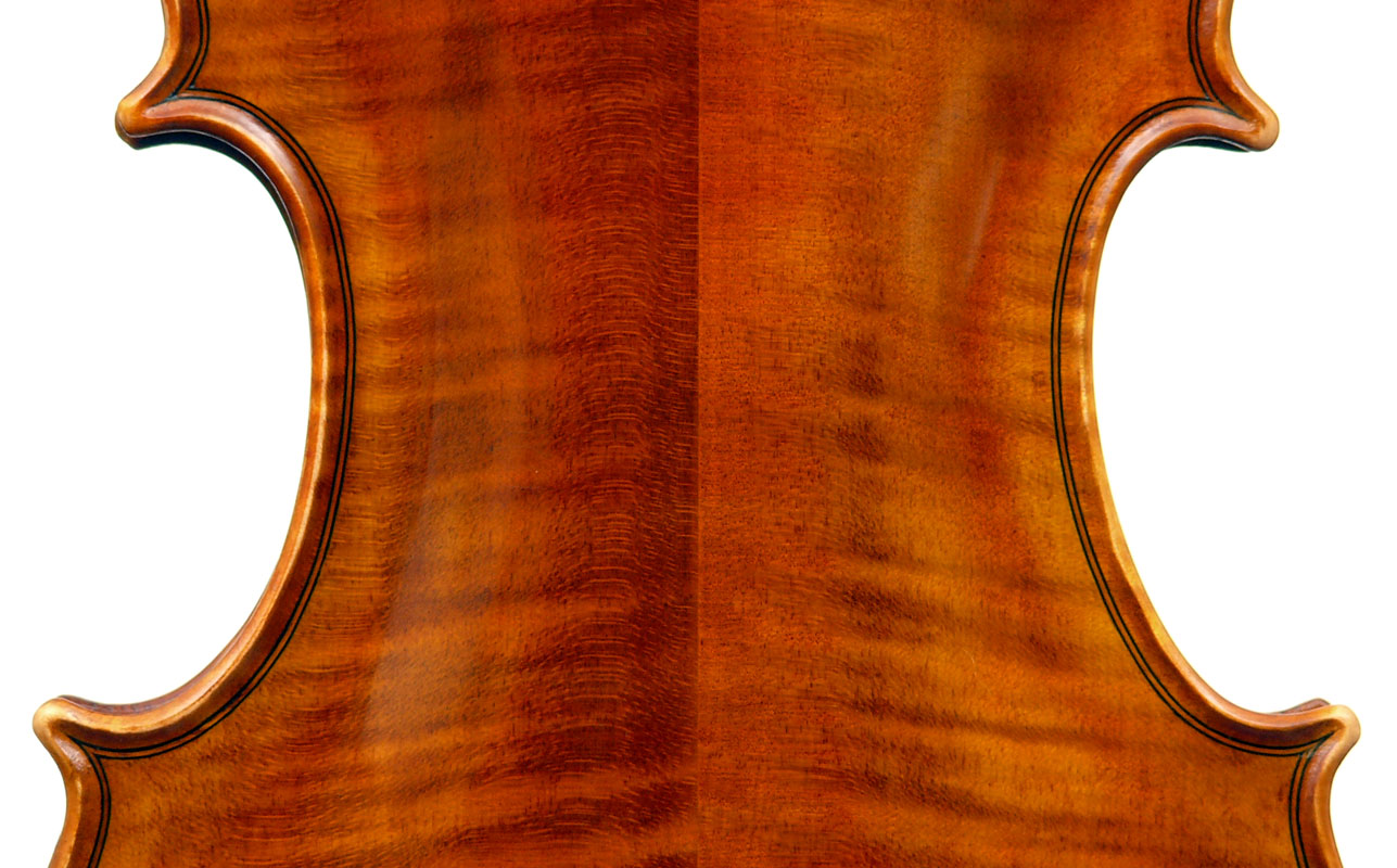 The two-piece back and ribs are of mildly flamed maple, with the neck and scroll being of more plain wood. The top is of superb Italian spruce with very narrow growth lines at the centre line widening to the flanks. The Fs are crisp with beautifully fluted wings. The purfling is supremely well-traced and the mitres simply outstanding (see photos). The varnish really deserves special mention - the texture is almost silky, not glossy but rather glowing and appears to have flexibility and also excellent transparency. The light-brown colour has a touch of red in it and compliments the materials nicely.