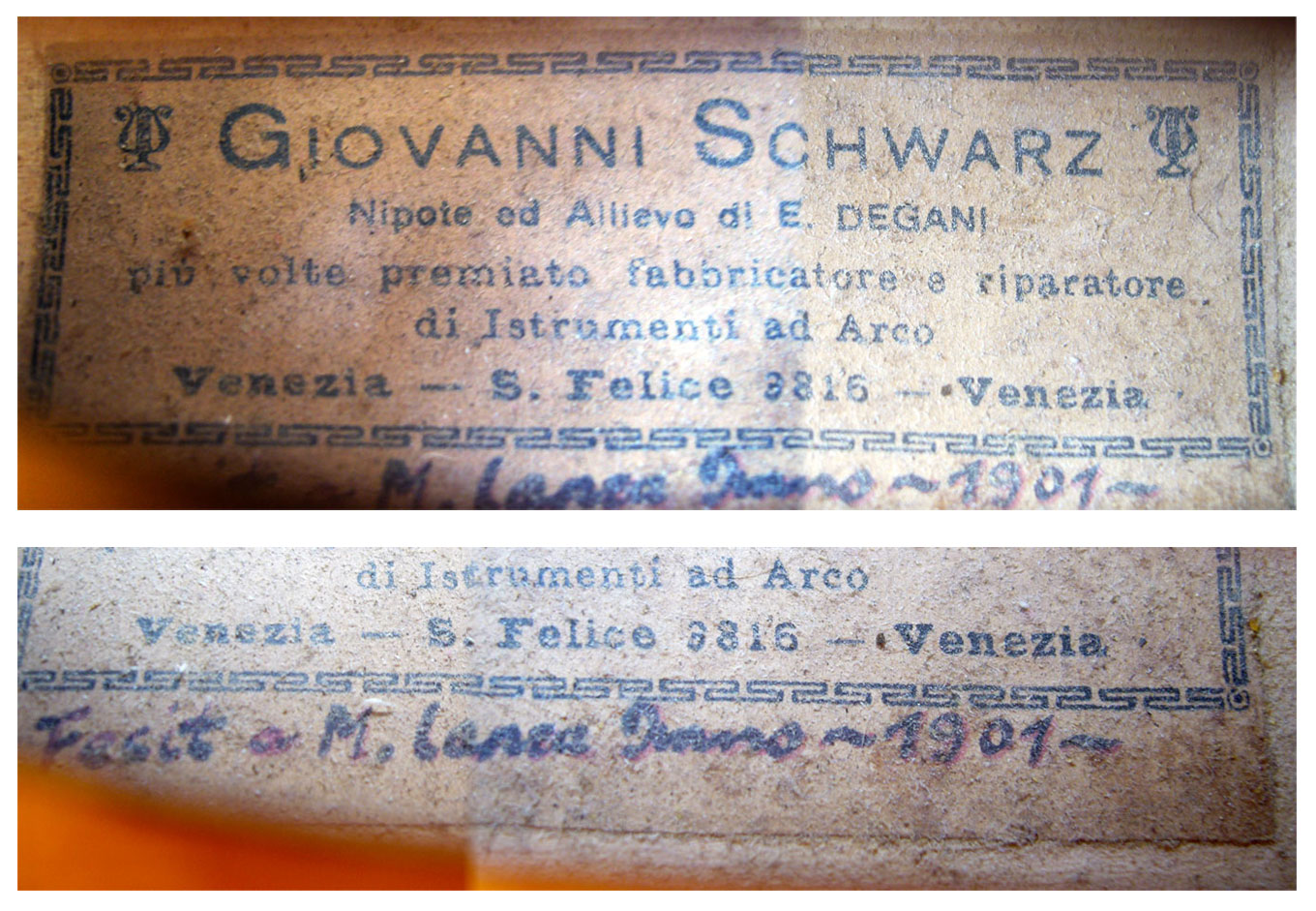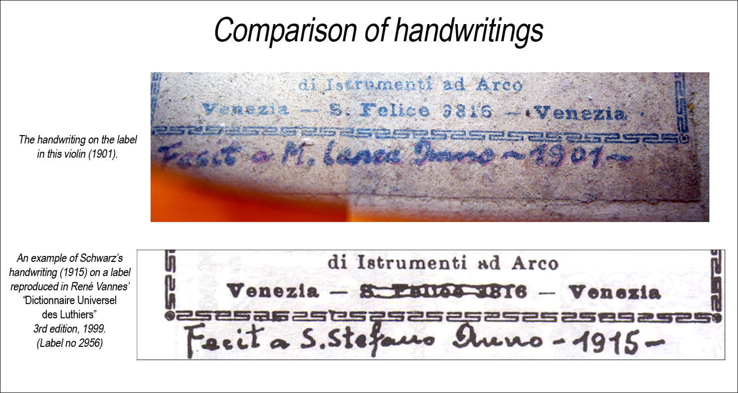 At the heart of the disagreement are two considerations: firstly, that the violin does not appear to be as old as dated on the label (1901), and secondly, that it does not follow the standard Schwarz model he used for most of his instruments and deviates from it to some extent.