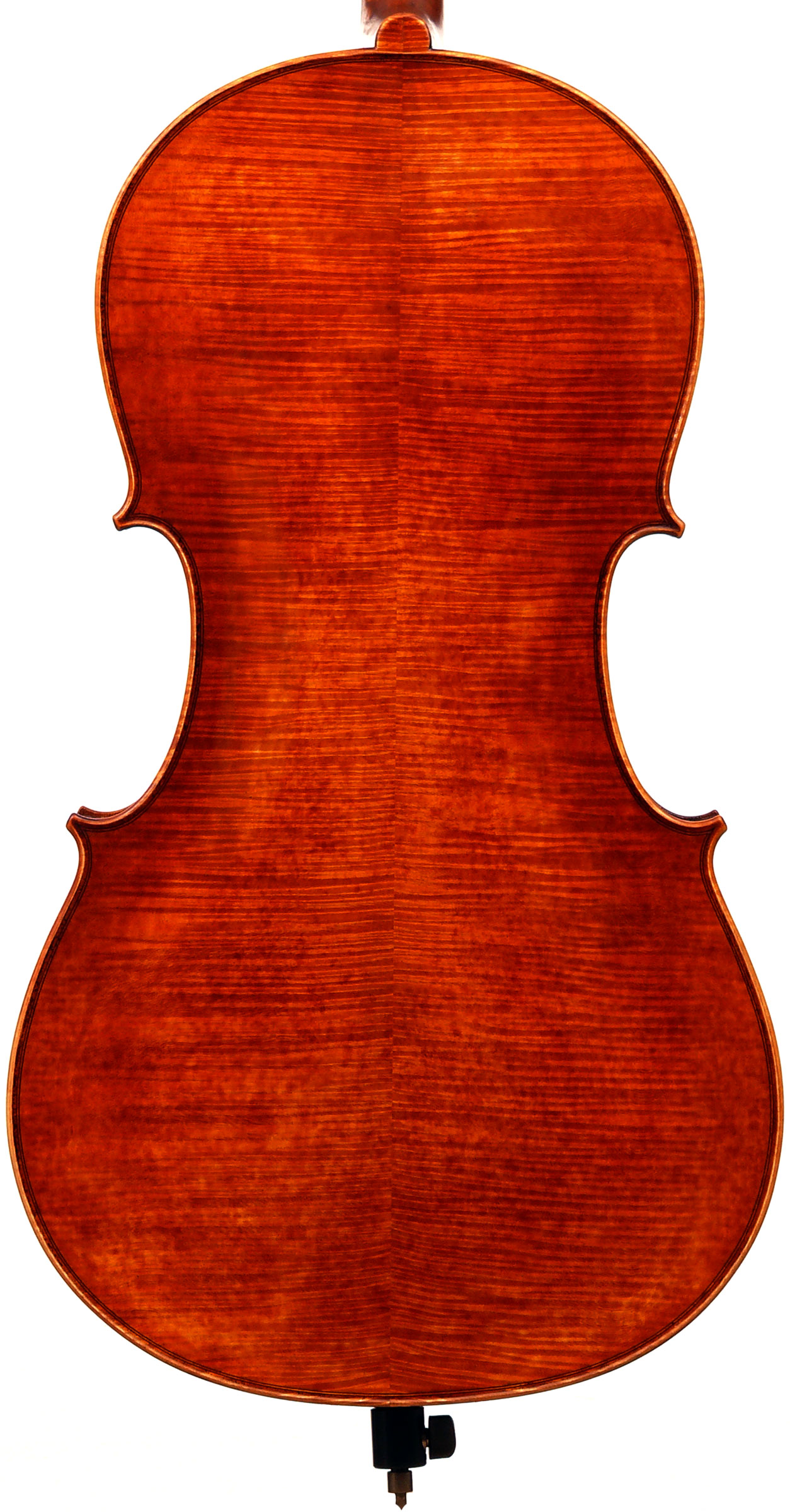 The varnish is a lovely intense reddish brown and has been deliberately reworked just enough to break the 'new' look and give it an aged appearance without actually antiquing the instrument. All who have seen this cello loved this aspect.